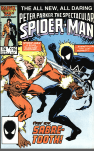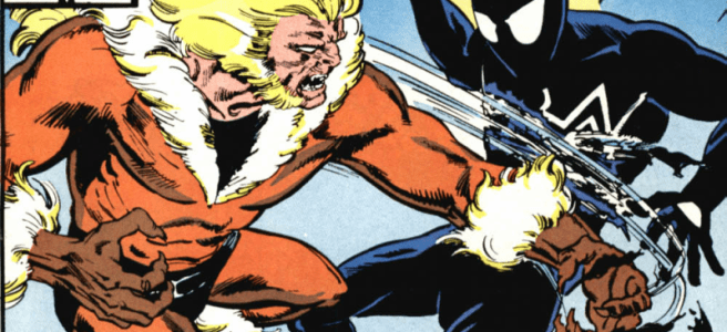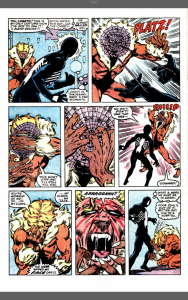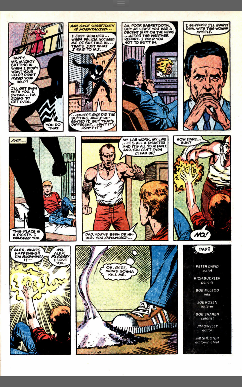 Injured and more than a little vulnerable, Felicia throws herself at Spider-Man, who knocks her back. He tells her about going to Doctor Strange to cancel out her bad luck effect on him and the fact it ‘might’ affect her. Now we get lover’s tiff no 3 and Peter storms out, just in time for Sabertooth to arrive hungry for blood. Spider-Man busts back in before Black Cat can do anything. Spider-Man and Sabretooth get into their fight as an automatic camera records it for the press. Peter ends the fight by webbing Sabretooth’s face and Sabretooth simply tears it away, along with several strips of skin from his face. Spider-Man leaves after another slanging match with Felicia. Foreigner decides to go after the notebook himself and the little boy with the glowing hand accidentally incinerates his father rather than face another beating and realises that he’s in trouble with his mum.