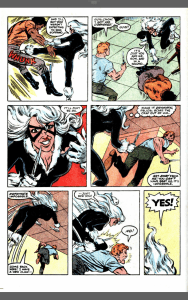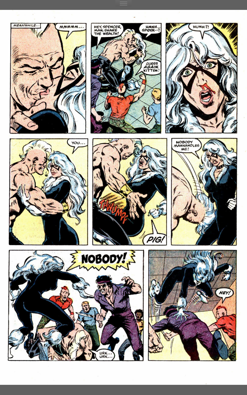 102 uses for a dead cat was written by Peter David, with art by Rich Buckler and Bob McLeod and opens with 5 ridiculous looking thugs about to kill Felicia ‘Black Cat’ Hardy (in costume) after breaking her nose. She’s suffering the effects of a concussion, hallucinating that the lead thug is Spider-Man.