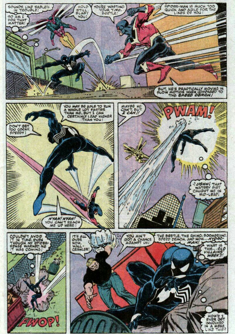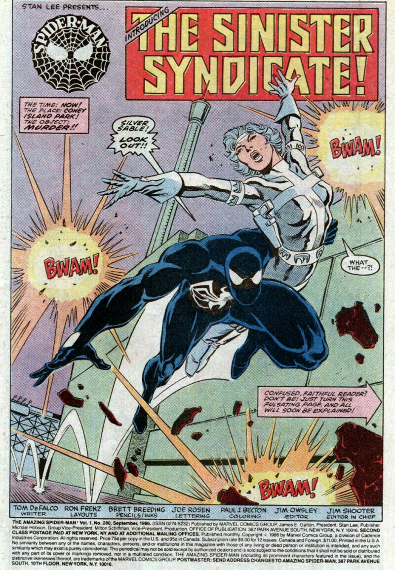 Subplot time. Flash Thompson is in police custody, accused of being the super villain known as the Hobgoblin. He’s also been accused of cheating on his live-in girlfriend Sha Shan with the married Betty Leeds, thing is that’s something he did do. The two women meet at the precinct and things are a bit tense as Sha Shan is quite keen to throw Flash under the bus in regards to an alibi, much to the chagrin of Sharon Banks, Flash’s lawyer. Peter arrives there and is informed that Flash’s defense will need more money. This inspires Peter to accept Sable’s offer to meet and go after Jack O’Lantern. The pair plan to meet at Coney Island and we’re back to where the story started, well once the arriving villains announce themselves as the Sinister Syndicate. Don’t laugh, that’s the name they went with.