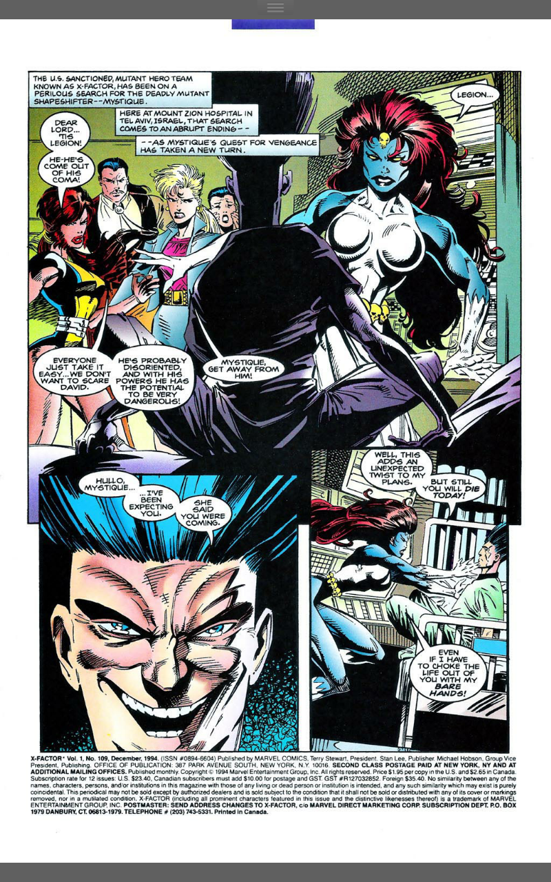 X-Factor 109 was cover dated December 1994 and was on sale in October 1994, sharing the spinner racks with Backlash 1, Bishop 1, Giant Sized Prototype 1 and Venom Seperation Anxiety #1.