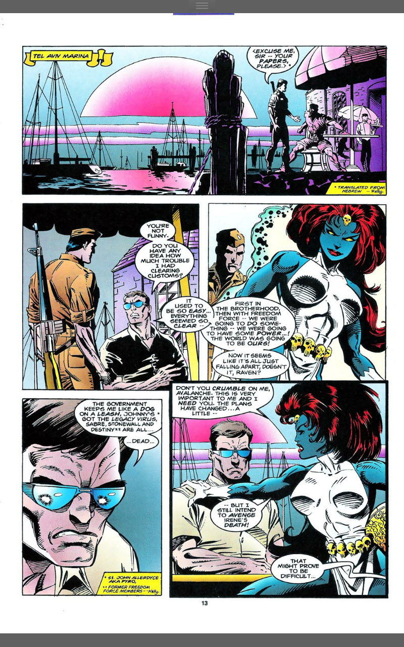 At Tel Aviv Marina, Mystique catches up with her former colleague Avalance, just as Val Cooper and X-Factor arrive. This causes a battle between the two sides, Avalanche causes a tidal wave, which is held back by Havok. Mystique uses this distraction to escape, only to be found by Wolfsbane, who fights with her, but doesn’t win. She does by enough time for Forge to arrive. Forge’s abandoning of Destiny years earlier is what gave Legion to chance to kill Destiny, so Mystique blames him to and the pair battle, only for the fight to be stopped by David’s arrival. David tries to talk to Mystique and this conversation includes fulfilling the promise to tell her that Destiny loved her. This psychic conversation leaves Mystique drained and then David turns his attention to X-Factor, whom he sends somewhere else and then flies off, exclaiming that he will fix everything.
