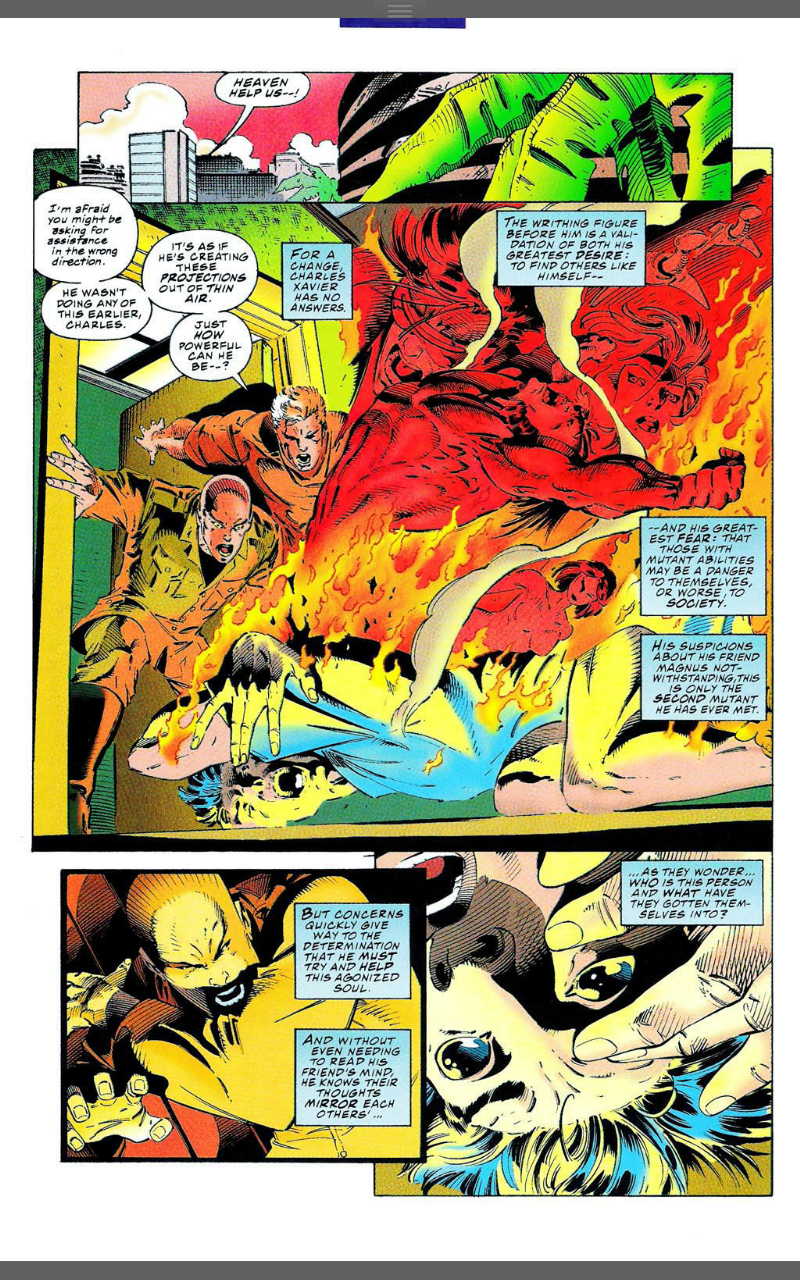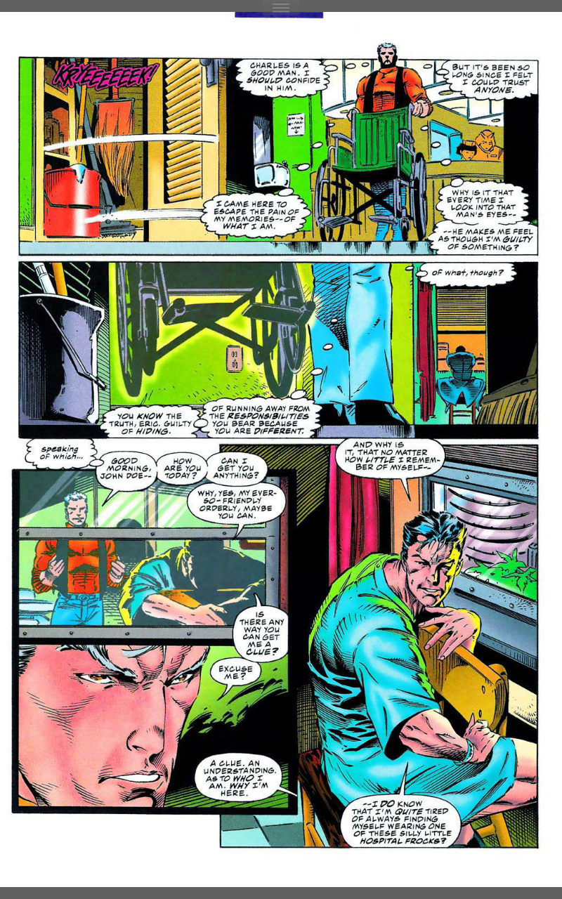 Plot: Twenty years in the past, Charles Xavier (not yet a professor) and Magnus (not yet a villain) have met and are working in an Israeli hospital as a doctor and orderly respectively. They are both aware that they have secrets from one another, but are quite good friends. As Charles plans for dinner with Magnus and his former patient Gabrielle Haller (how reassuring that we have some unethical s**t from Xavier), Magnus checks on a patient, a amnesiac John Doe, who the reader will recognise as David ‘Legion’ Haller, someone who is yet to be born.