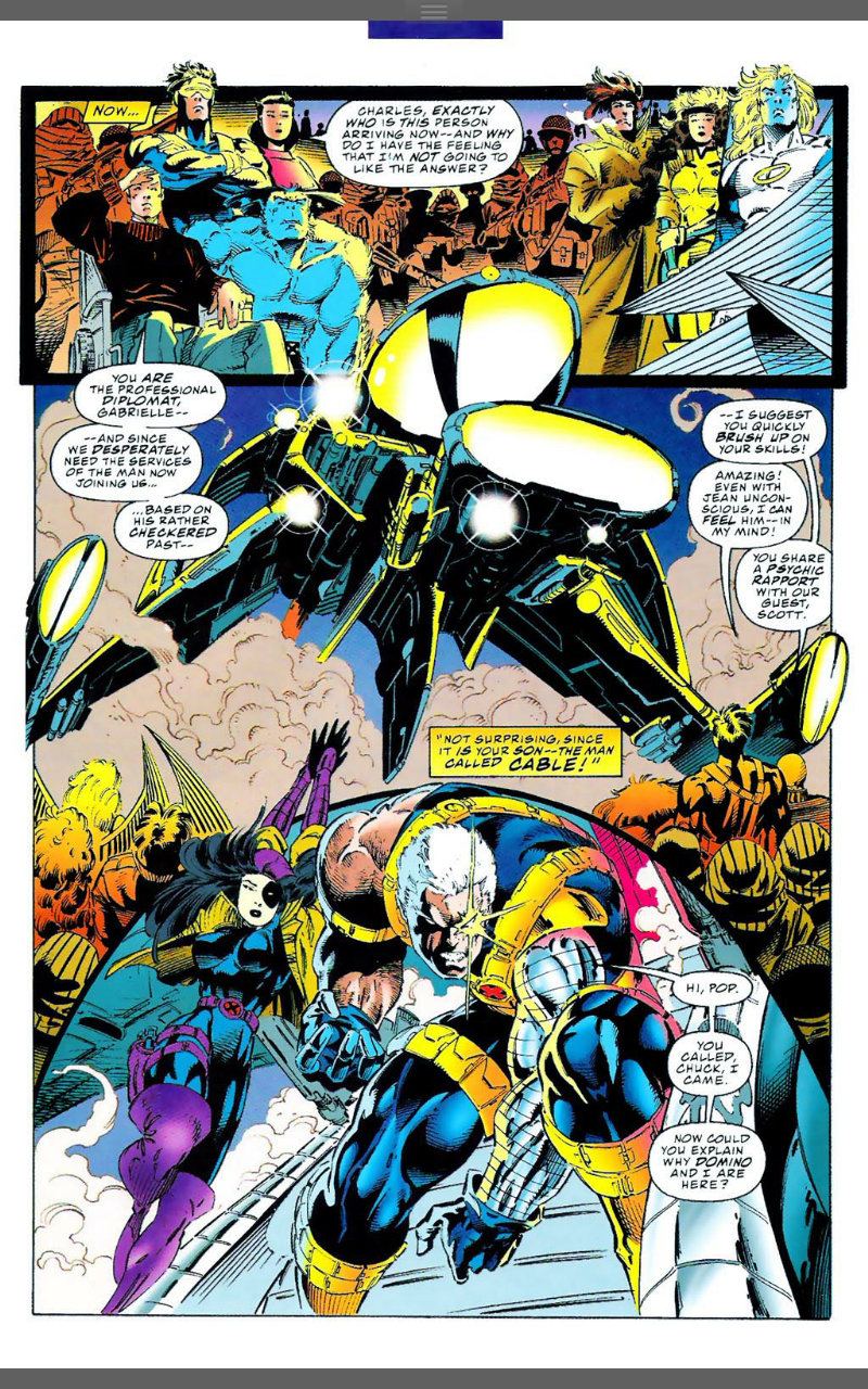 Back in the present, Professor Xavier, Gabrielle and the assembled X-Men welcome the arrival of Cable and Domino, Cable being something of an expert on time travel being the time displaced son of Cyclops, who is younger. As Cable points out that he has no ability to get to the past anymore, the talk is interrupted by Lilandra Neramani, both Charles Xavier’s ex and the Mahestrix (Empress) of the Shi’Ar empire. She’s there in hologram form to tell those present that the past is being altered and it’s affecting the cosmos. When asked how she can know this, she informs them that this information comes from the Watchers.