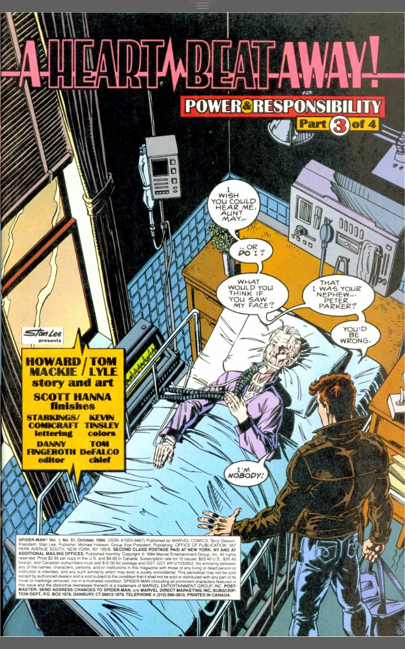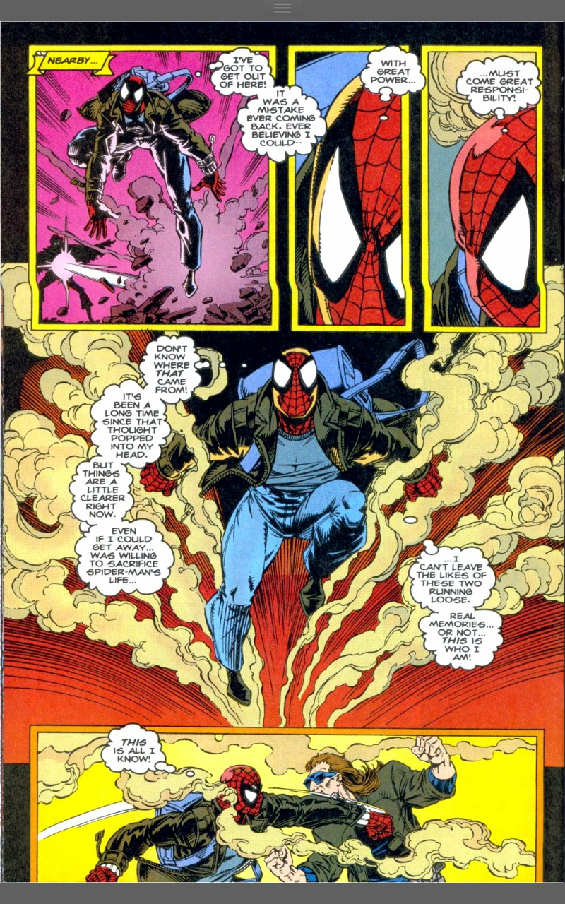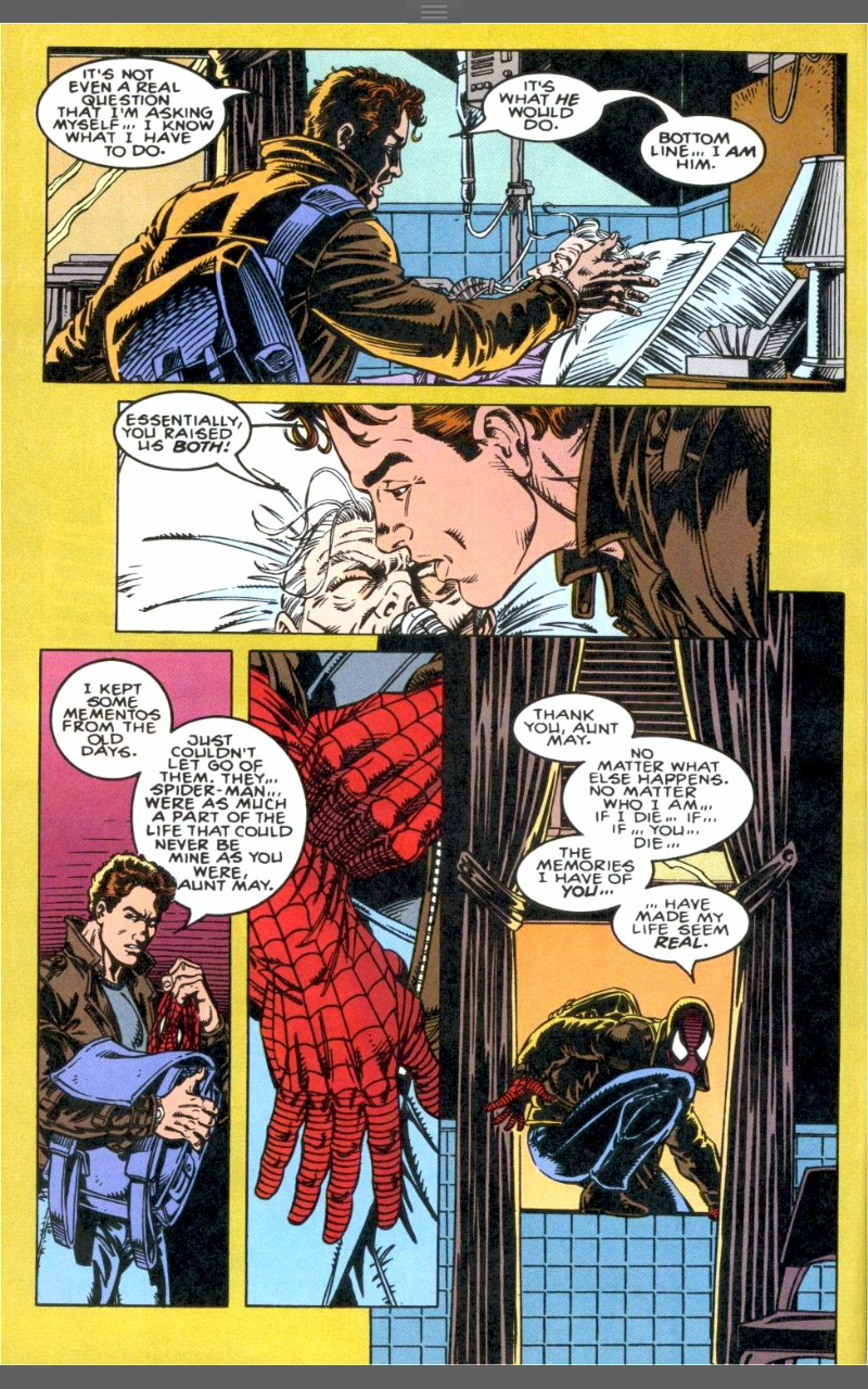 Plot: The clone of Peter stands over an Aunt May he remembers, but knows he doesn’t know. He talks about Chakra’s message and reveals his name to be Ben Reilly, after her maiden name and Peter’s uncle. He talks about having to just wait it out and he can claim a real life, but he remembers most of that life and knows that he can make no other choice other than to try and save Peter.