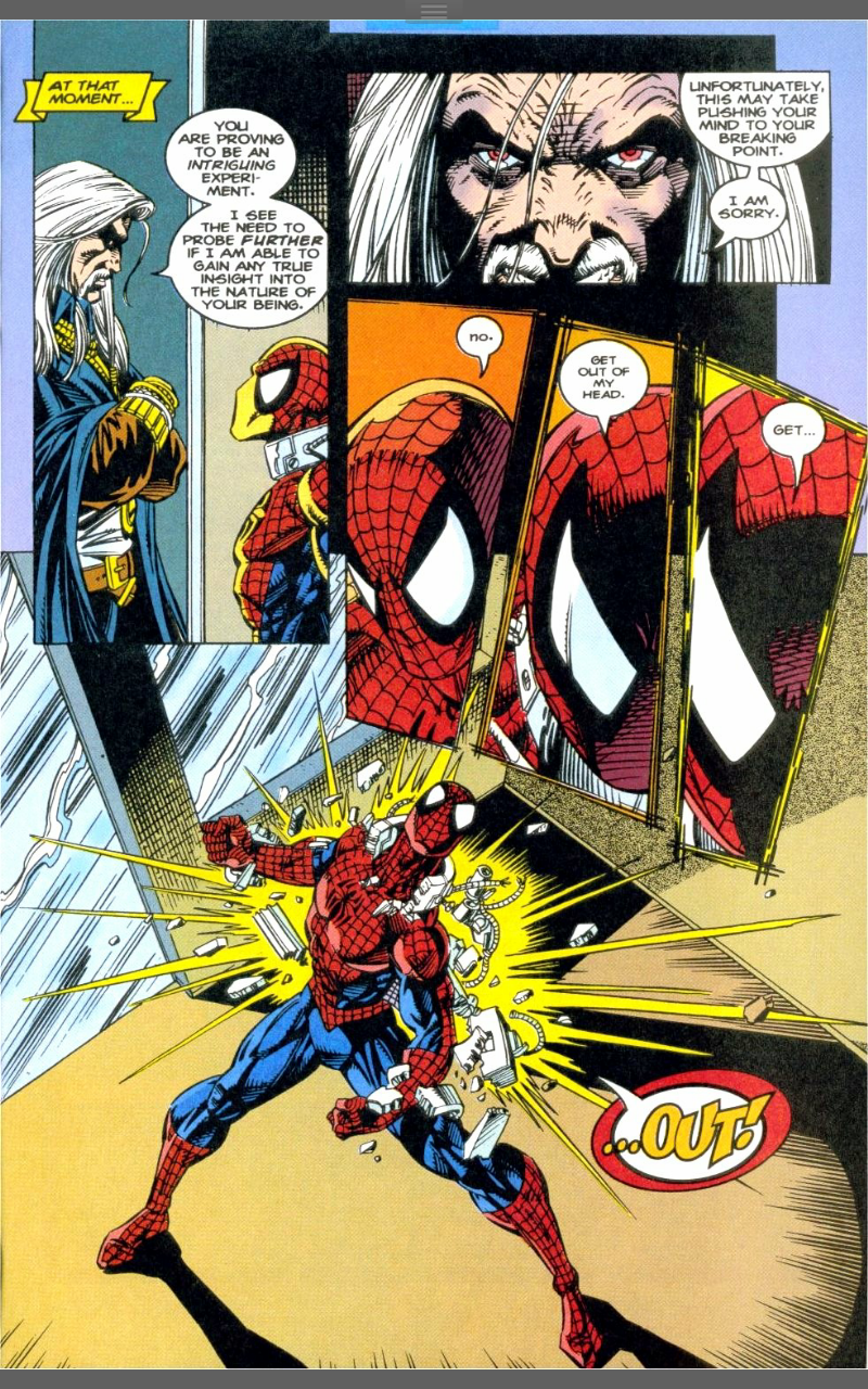 Elsewhere, Peter is hallucinating old villains and his unmasked self and through this dream-state is reminded that with great power comes great responsibility. He comes to, with his madness behind him, he bursts through his shackles and attacks Traveller. Things aren’t going well with that, until Ben arrives to tell Traveller that he is taking Peter out of there.