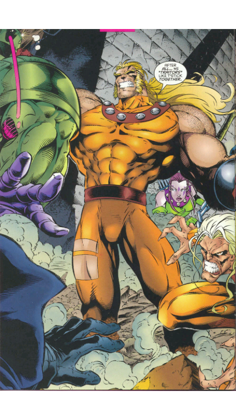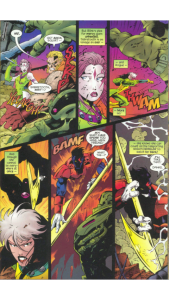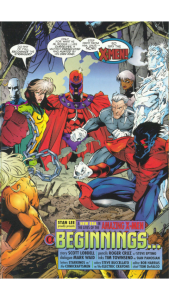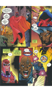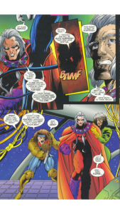 This is not a team we known either, in look or in lineup. This team of Sabretooth, Wildchild, Blink, Morph, Rogue, Quicksilver, Storm, Iceman and Nightcrawler face off against the Infinites, who don’t fare too well against this savage group. They all fall and Unus, who points a gun loaded with non-ferrous bullets at Magneto is flash-frozen by Iceman. The victorious team face the stranger, who is revealed to be the Lucas Bishop who was lost in time when Xavier died 20 years earlier. When he sees Magneto, he launches at him, full of rage, only to be brought down by Magneto stopping the blood flow to his brain for a brief second.