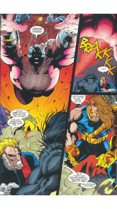Elsewhere, Henry McCoy, the Dark Beast of the Pens is experimenting on Fred ‘the Blob’ Dukes, who escapes his bonds and attacks his tormentor. Beast is saved by Prelate Alex ‘Havoc’ Summers, who in turn is saved by Alex’s brother Scott. This long hair version has only one eye and has zero f**ks to give. He demands that Beast knock off what he is doing. Alex bickers with his brother, till both are forced into neutral corners by their adoptive father Sinister. Sinister takes Scott aside and they walk and talk and Sinister cryptically suggests that he is about to leave.