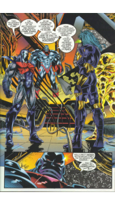 The art is very stylised, the overly muscled bodies, the odd anatomical proportions and other flourishes are very much 90’s tropes that have dated this comic beyond any adverts that were in it. Truth is, Roger Cruz handles layouts and panel progression really well and he is consistent enough that every character is recognisable as themselves even in this new universe.