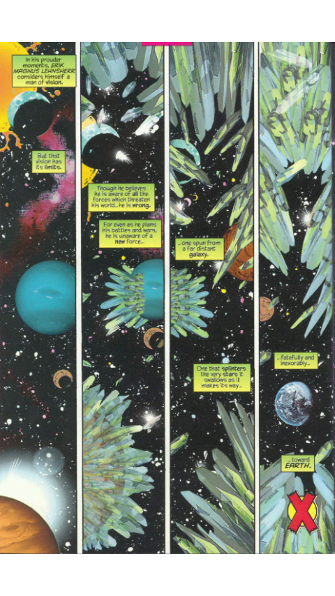 Back in Westchester, Rogue uses her powers to channel Bishop’s mind, through Magneto and the three of them get a look into the reality that would have been had Legion not killed Charles Xavier back in X-Men 41. The dangerous contact is broken by an arriving Gambit, but it’s clear that what he did see, has shaken Magneto to his core. Nightcrawler is sent to find his own mother and the air is heavy with the sense of impending doom. Magneto has to act, in the name of a man who died years ago and in deep space, waves of crystal begin moving their way towards the Earth.