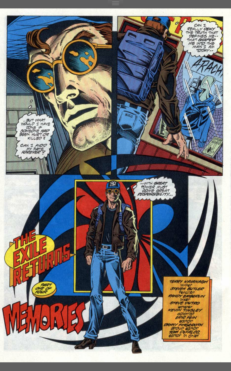 Seriously though, I liked this issue. Kavanagh lacks DeMatteis’ deft hand with the psychology of Spider-people, but conveys the themes really well and shows some difference between the voices of Ben and Peter and Butlers art has a 90’s flavour, but does the job very well. It’s a bit of a B-title, but it’s a solid B.