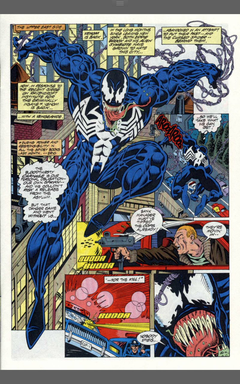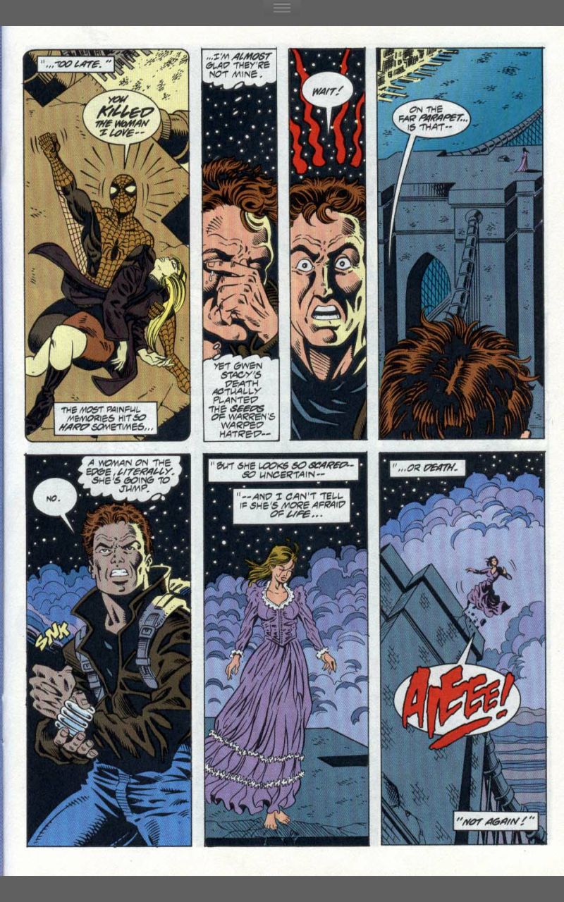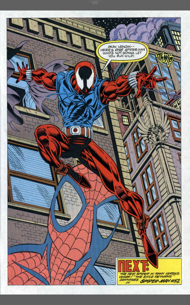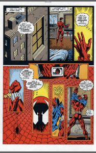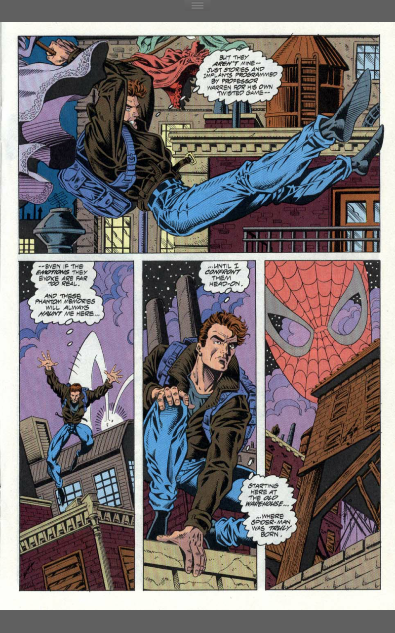 Notes: Thisis the story of identity and compulsive behaviour. It’s about coming to terms with who you are whilst not still not knowing who that is. Ben is not Peter, he’s determined not to be Peter, but the things that drive him are the exact same things that drive Peter. It’s that borrowed responsibility that pushes him to save a woman from falling to her death and to adopt a new costume to go after Venom in. Venom is also trying not to be in New York. The story tries to parallel the two, but it doesn’t really take, but keeps Venom as part of the story and highlights the differences between Peter and Ben. This story is about Ben’s need to not be a super hero and how his memories of Peter’s life constantly conflict with that. A woman on a bridge reminds him of Gwen Stacy and all the pain that brings, compels him to save her as Peter couldn’t save Gwen. There’s no way Ben can leave it alone once Venom’s presence is felt, so Ben starts back on the path of the masked hero. Like Peter he uses webshooters and a spandex suit, unlike Peter, he chooses a simple red all over look and adds a sleeveless blue hoodie with a spider logo and for some reason (that still 23 years later I do not understand) ankle pouches…ANKLE POUCHES?!?