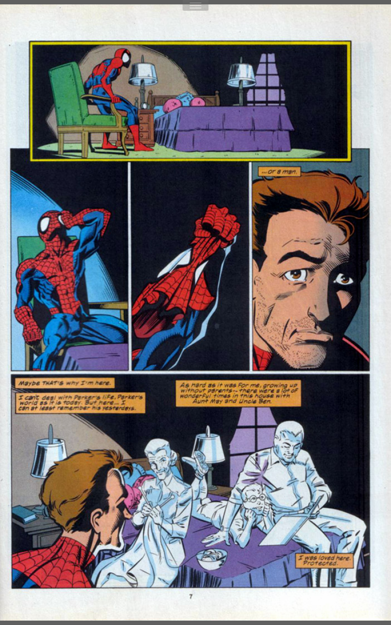 We now find Spider-Man standing in the Forest Hills house, he grew up in. Standing there in his rain soaked costume, unsure of what he’s doing, walking through the past of the person who he no longers wants to be. He walks into his bedroom and sees the ghosts of his childhood, a happier Peter, an Aunt May not lying in a hospital bed and an Uncle Ben, alive and well. It gets too painful and he leaves, unsure why he’s even gone there at all. Elsewhere Mary Jane Watson-Parker visits her sister Gayle and is welcomed with open arms.