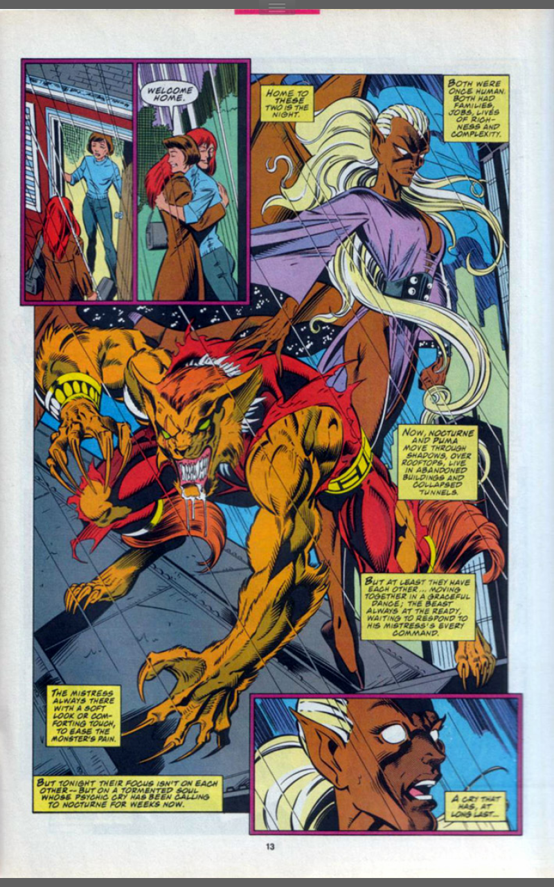 Plot: A drug deal in Manhatten is interrupted by the bat-winged Nocturne and her compatriot, the almost feral Puma. The moneyman in this deal, Clifford White is cornered by Puma and is brought to his knees by the emotional powers of Nocturne and he screams, feeling all the pain his drugs have caused.