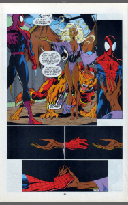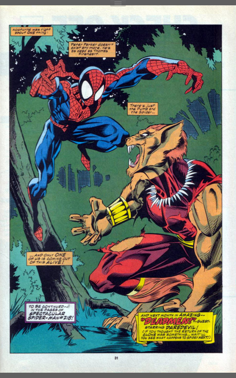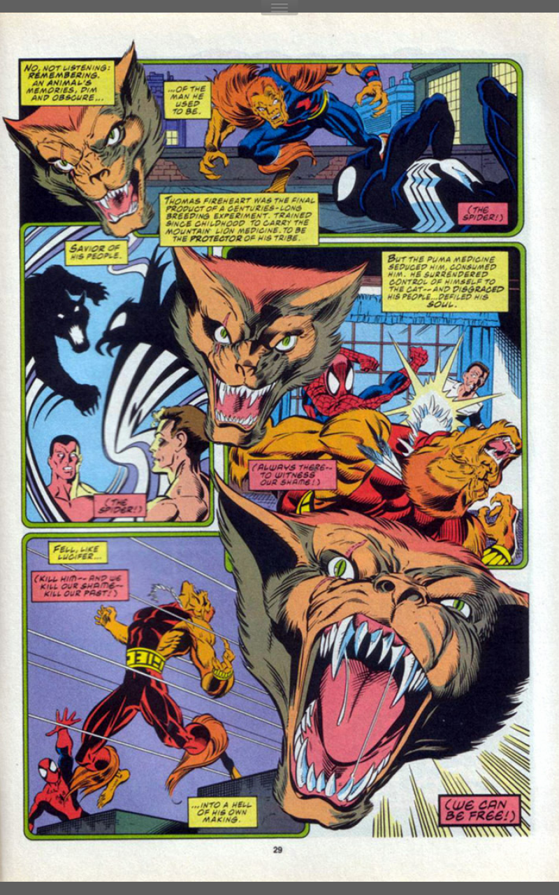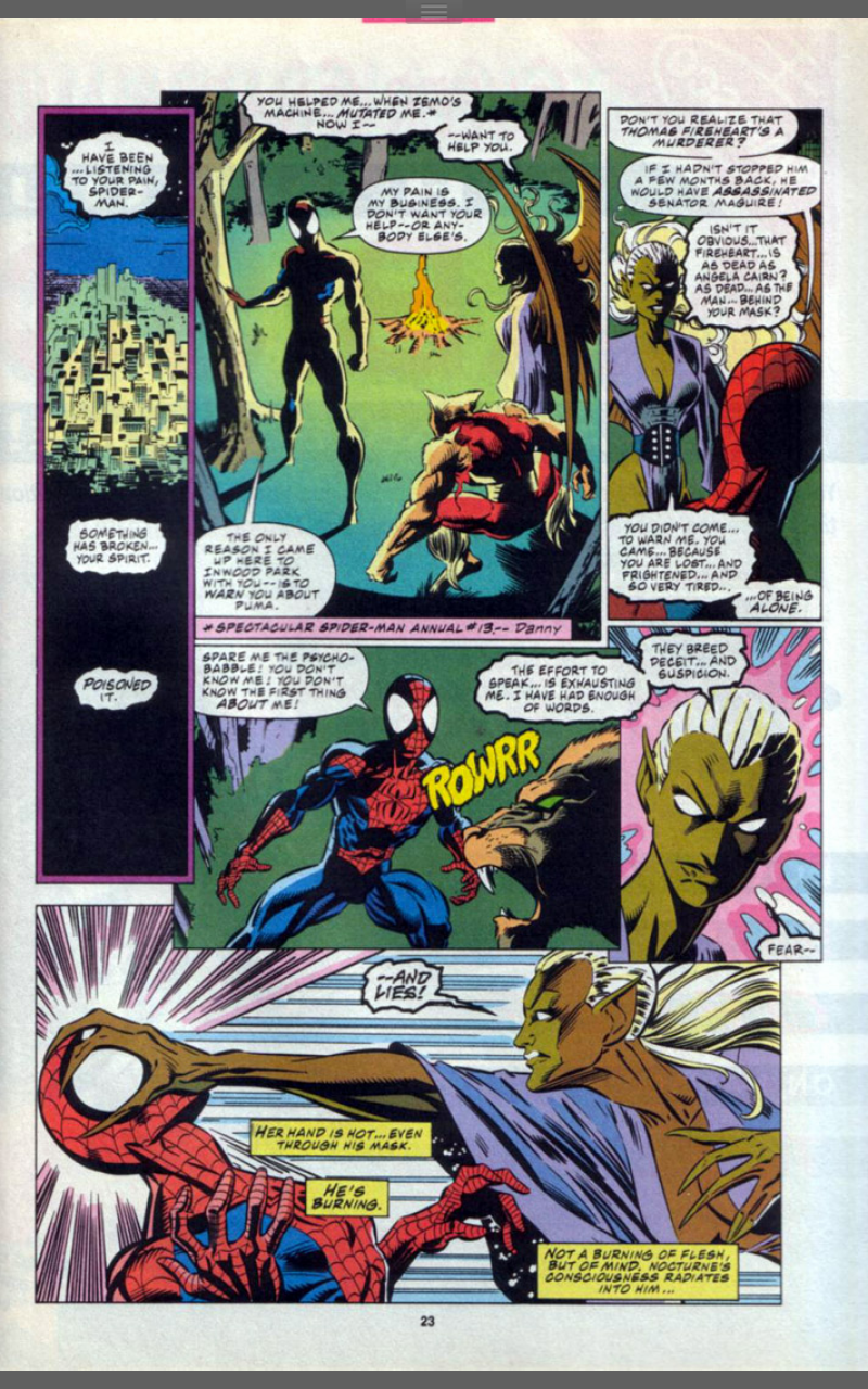 Spider-Man fights back and before this escalates, Nocturne tries to make peace, using her emotion powers to explain that Puma has submerged his humanity and is just a wounded beast in pain, just like Spider-Man. But Puma hasn’t quite submerged all of his human side and remembers his enmity towards Spider-Man and the attack begins again. This time Nocturne is injured and the Puma and the Spider square off, with nothing to hold them back from battling to the death.