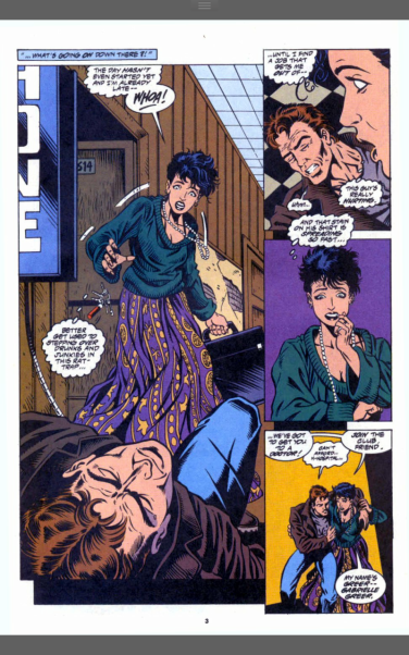 He is found by a neighbour Gabrielle Greer, who gets him to a clinic that will help someone who clearly is without insurance. The problem is that intrepid journalist Ken Ellis is looking for the Scarlet Spider (a name he coined) and has put the word out for any information about adult men with severe stomach wounds. The nurse at the clinic makes a call to Ellis to inform him of the unnamed man she’s been treating. Following Ken, to get to Ben, to get to Venom is the Symbiote creature from the last issue. She thinks to herself that she doesn’t need to camoflauge herself, just before doing so.