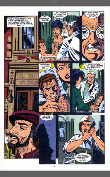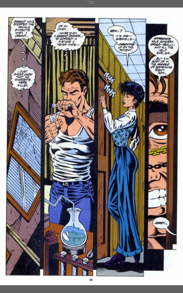 Ken Ellis arrives at the clinic, missing Ben by seconds, but the symbiote creature is on the roof waitingfor him and he really doesn’t have time for this and goes to leave. In a tantrum, she destroys part of the roof, which Ben has to stop the falling pieces from hitting someone. This being another way of beating the whole ‘power and responsibility lesson’ over Ben’s head, he goes home and starts working on stuff to help stop Venom and the other one, blowing off Gabrielle, when she pops by to check in on him.