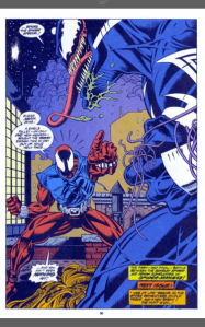 Armed and ready he goes after the symbiote creature, who is now under attack by Venom, who has spent the issue looking for the Parker family, with Mary Jane out of town, Peter out his mind and May in hospital, he finds no-one, so by the end of the issue is pretty wound up and takes it out on the other symbiote. He’s about to tear the symbiote from it’s female host, when he is attacked by a gooey ball, which becomes webbing that wraps around his head, buying enough time for the Scarlet Spider to arrive and point out to Venom that he’s seen nothing yet.