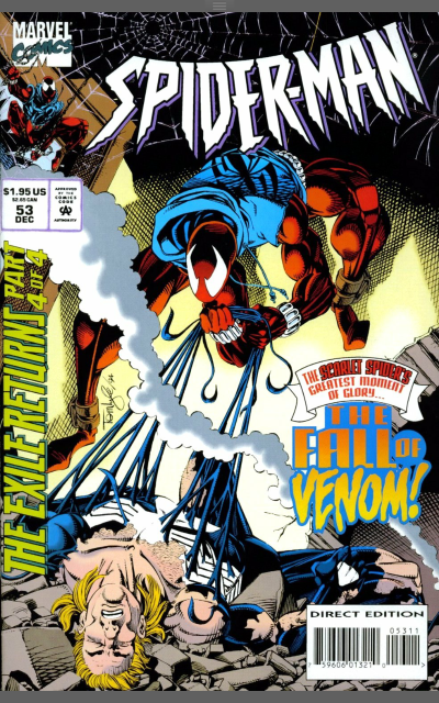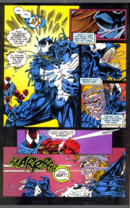 Plot: Venom chokes the faux Spider-Man Ben Reilly, until he punches over several rooftops after deciding not to let Venom kill him. Elsewhere Ken Ellis is working late at his job at the Daily Bugle and is interrupted by publisher J.Jonah Jameson, who gives him advice about not being obsessed by the story. This is advice almost immediately ignored by Ellis. Back at the fight, Ben uses his new impact webbing to slow Venom down. Somewhere else again, the son of Kraven the Hunter is vowing at his father’s grave that he will gain revenge against Spider-Man. Salt Lake City Utah and a Detective Raven is shown photos of a New York crime scene that matches a cold case from two years ago, a case he has been on ever since. Back in New York and Gavin Thorpe has returned, killed his younger brother and re-established his control over their ‘organisation’ he asks for information on all the obstacles to his new prosperity, policemen, DA’s and also Spider-Man.