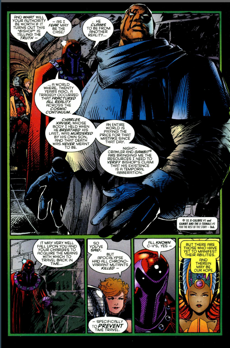 After this session, the teachers are joined by Magneto, who brings Bishop with him to explain the plot essentially. Bishop is from another timeline, one devoid of the rule of Apocalypse and Magneto plans to restore that timeline, but for that, they need a mutant with time travel abilities.