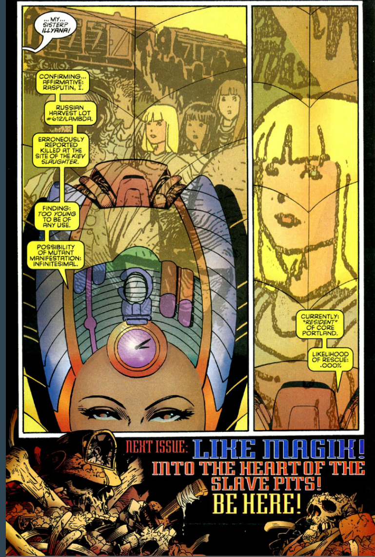 Know-it-All scans Apocalypse’s systems, confirming that all known mutants with Chronological abilities are deceased, but one with the potential has been found, one of the suvivors of the Russian genocides Ilyana Rasputin, Colossus’ long thought dead sister. Know-it-All tracks her to a slave labour camp in Portland. Colossus and his students have a mission, break into Portland Core and rescue this girl, so she can rescue reality itself.