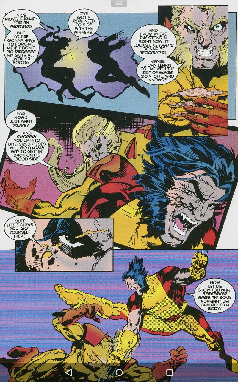 The Horsemen complete their takeover of the base, killing all of the soldiers before the X-Men arrive. By this point Sabretooth has gained control of the missiles, but Candra informs him that they missiles are to be immediately launched, not simply controlled. Sabretooth balks at this, losing his position within the Horsemen to Candra, but Candra aims him at the X-Men rather than kill him. Jean Grey takes on Candra, Weapon-X takes on Sabretooth, while the rest of the X-Men battle War and Death.
