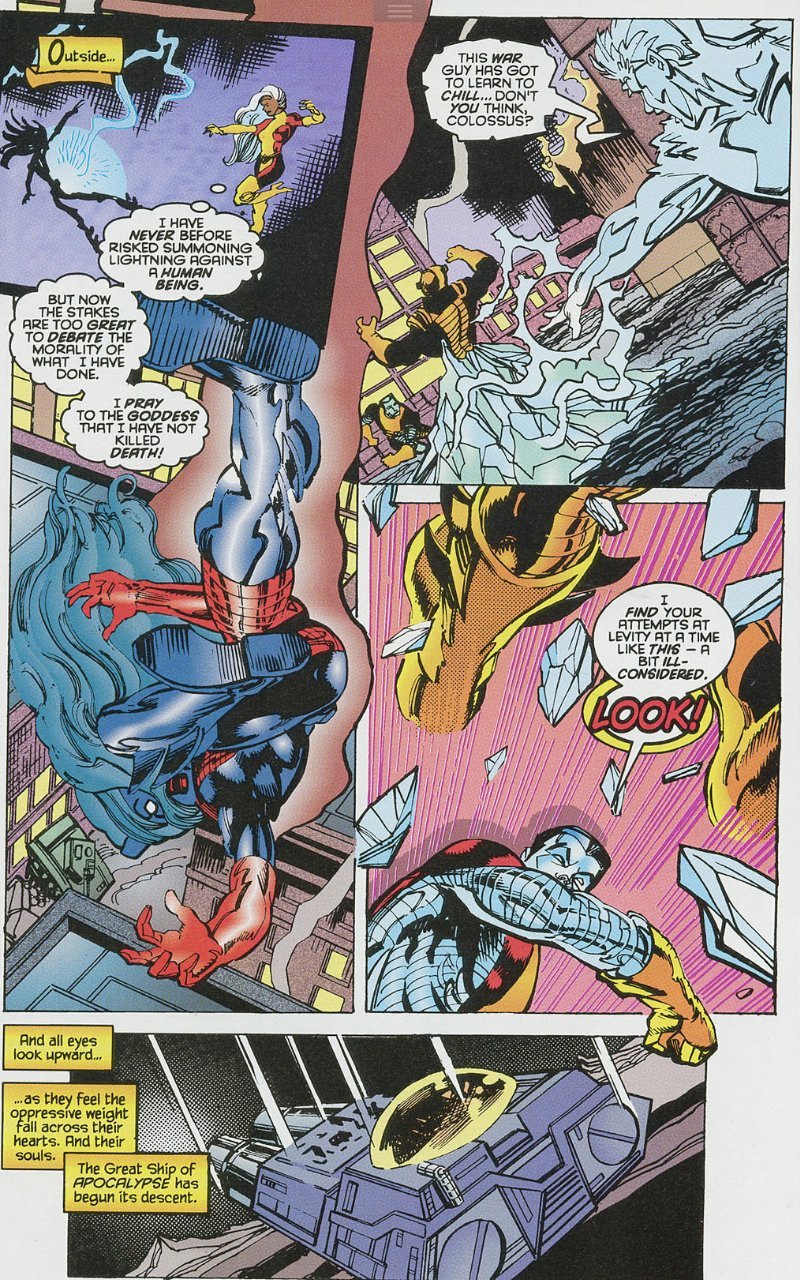 Then this is the perfect time for Apocalypse’s ship, which was stolen from the Celestials, to appear over New York and project a huge image of his herald Candra who informs the human population that their time is done and the age of mutant supremacy has arrived.
