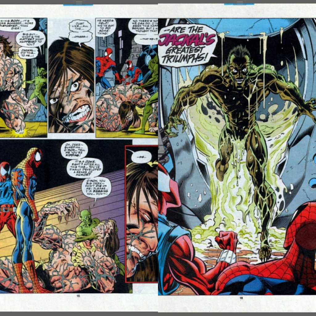 Art 5 out of 5: If there is a list of influential creators on Spider-Man you have to start with Ditko, Romita and you can very much include McFarlane there too, but after that list are those that took those influences and run with them. Bagley is one of those. He takes the character design and gangly proportions of Ditko, the glossy sheen and storytelling that Romita added as well as McFarlane’s expressive qualities and you get Bagley, one of the best all around pencillers of Spider-Man. He did it all and the pages look beautiful. He was the artist who’s parts of the stories you looked forward too and this was no exception. If the Jackal emerged in any other part of this story, it wouldn’t be anywhere near this powerful a moment. Everything looks great from the action to the designs (despite how 90’s they were) and the colouring is also bright and well lit giving the whole thing a slickness and mass appeal that a flagship comic series needed to have.