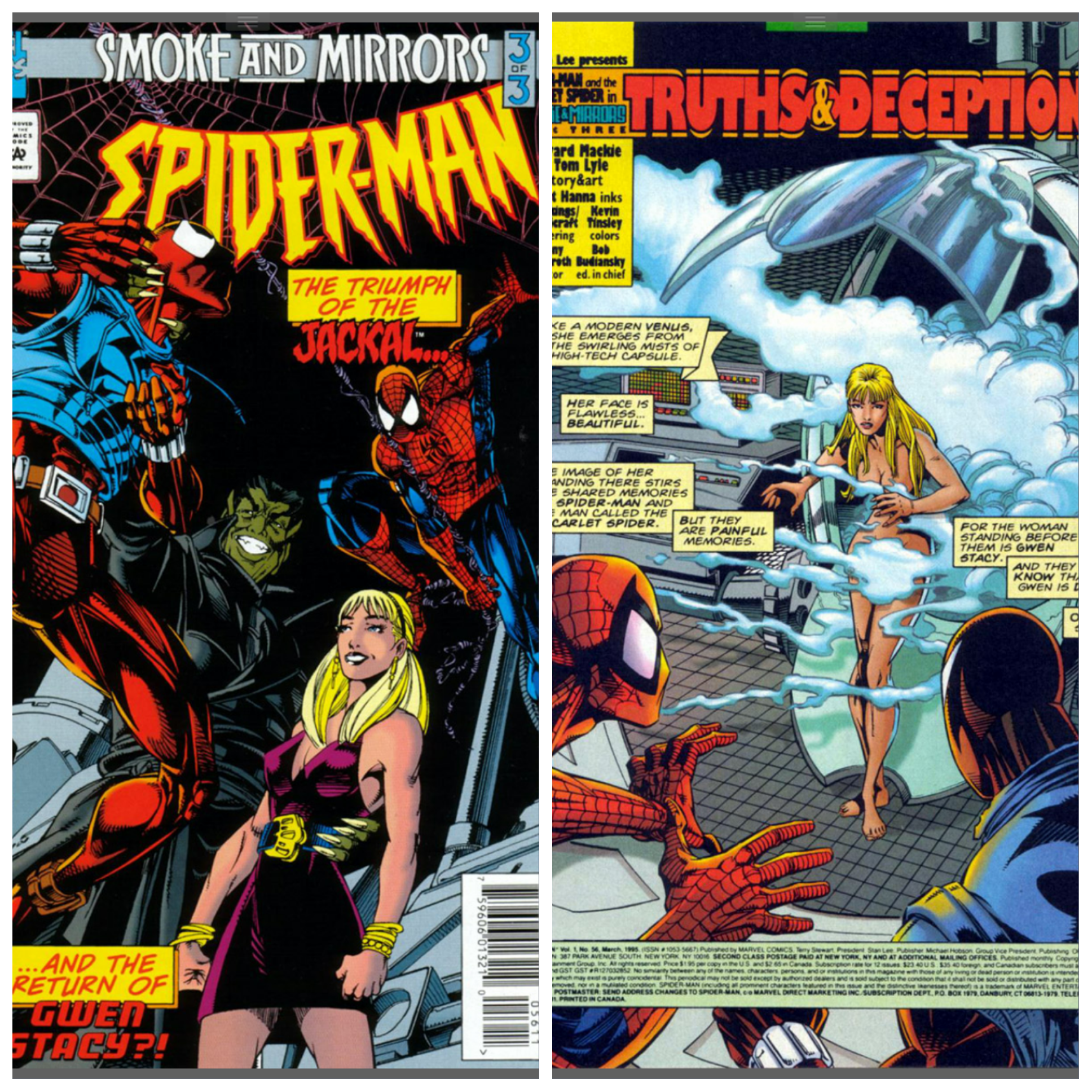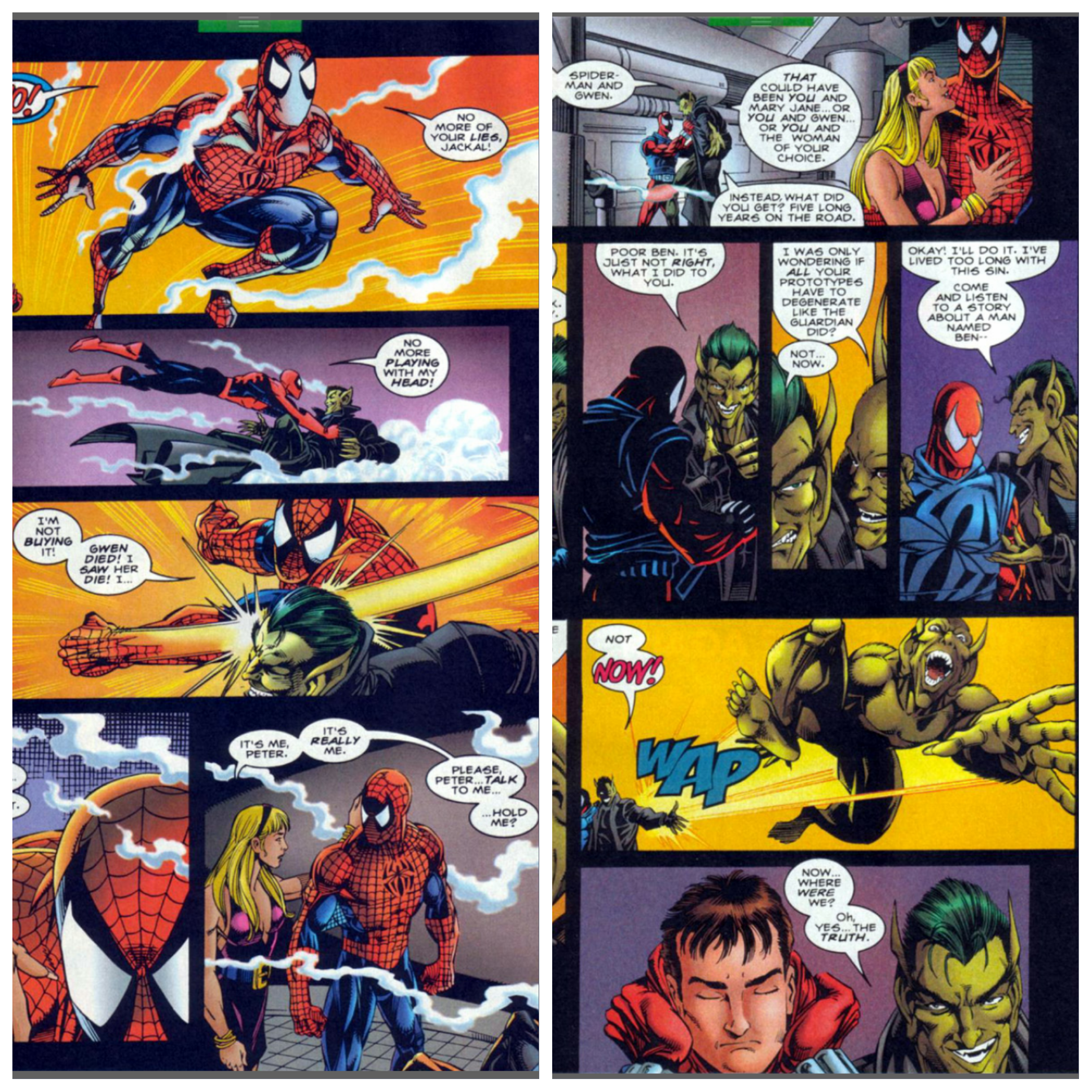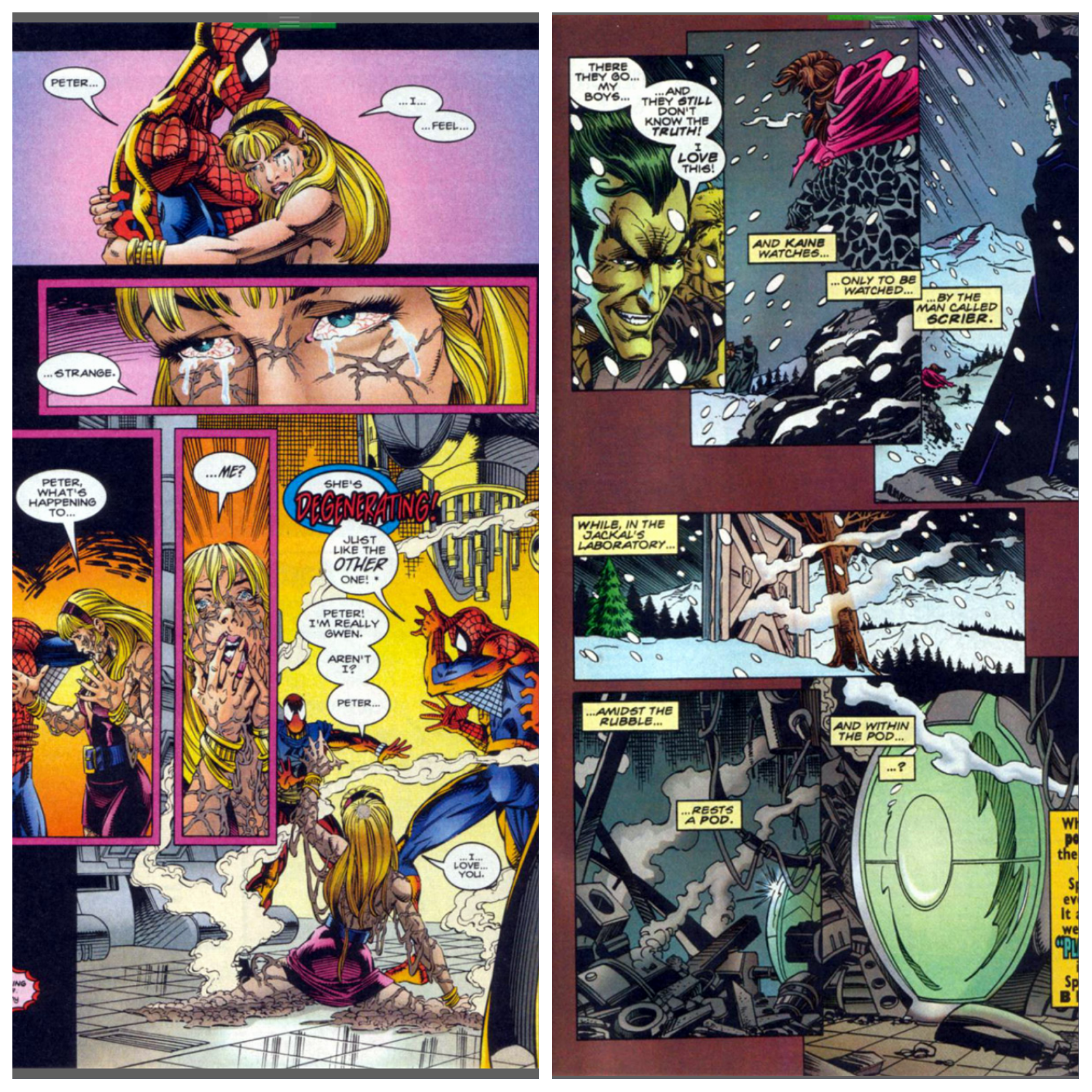 Plot: Jackal reveals and then dresses Gwen Stacy who is confused by the Spider-Men she sees before her and wants Peter to explain whats going on and to hold her while the Jackal plays mind-games with Ben. He tells each of them that they are the original, then each of them that they are the clone.