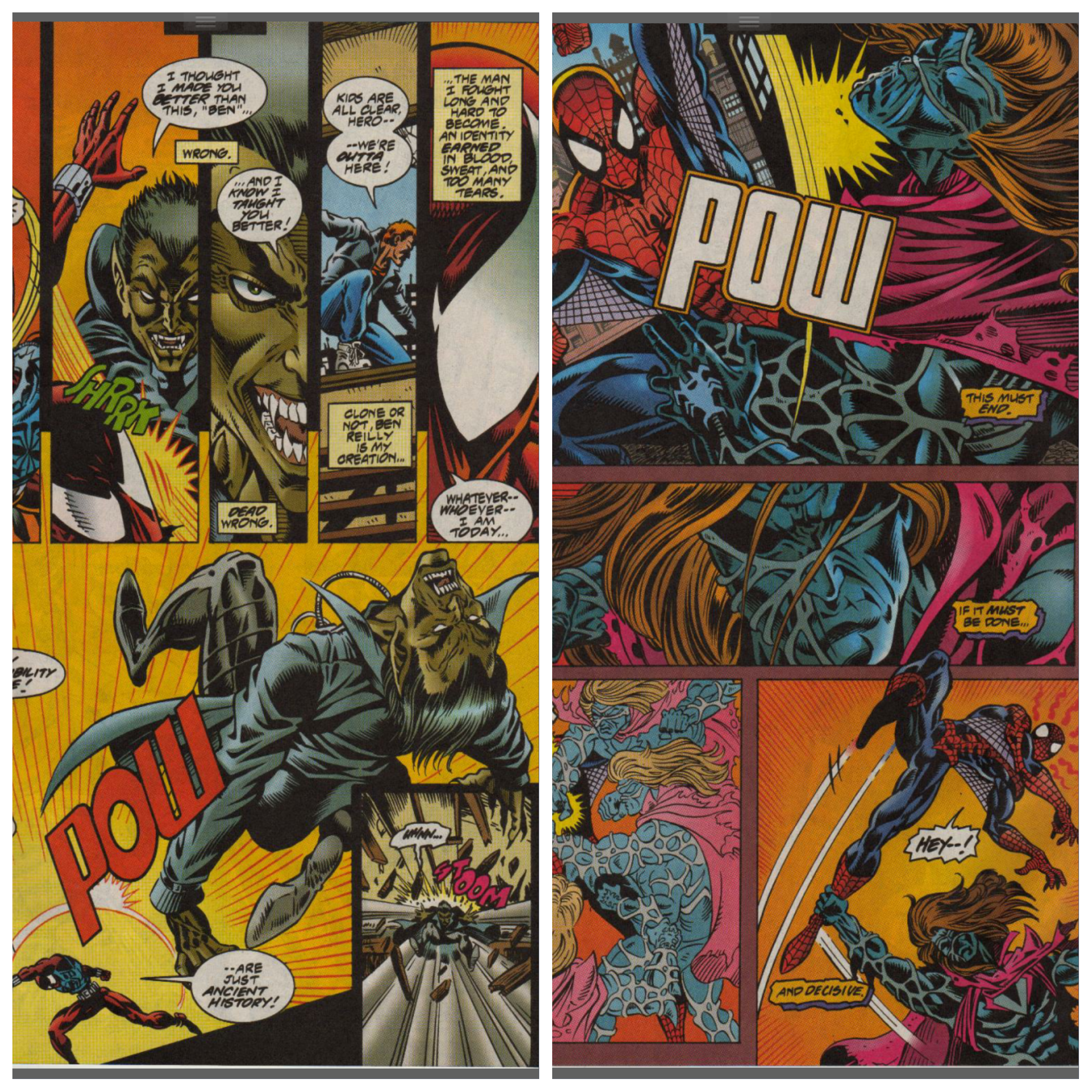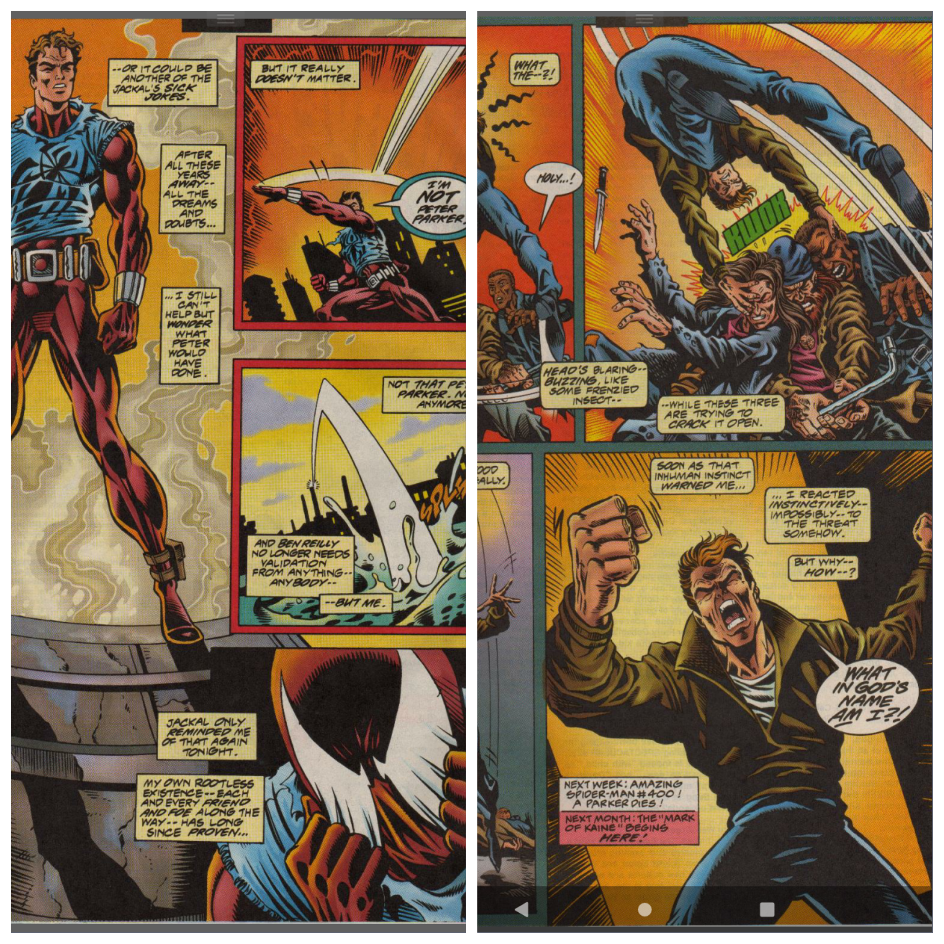 Across town, Spider-Man faces Kaine over his delivering of proof that Peter is the original and not the clone. Spider-Man wants answers. During this confrontation, Kaine wonders if he is following his own plan, or simply doing exactly what the Jackal wants to happen.