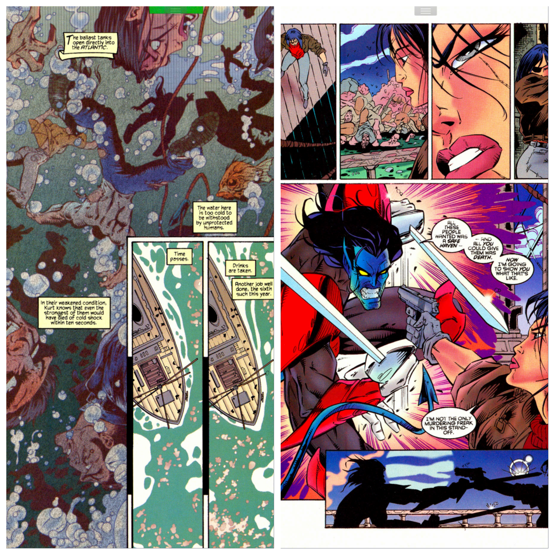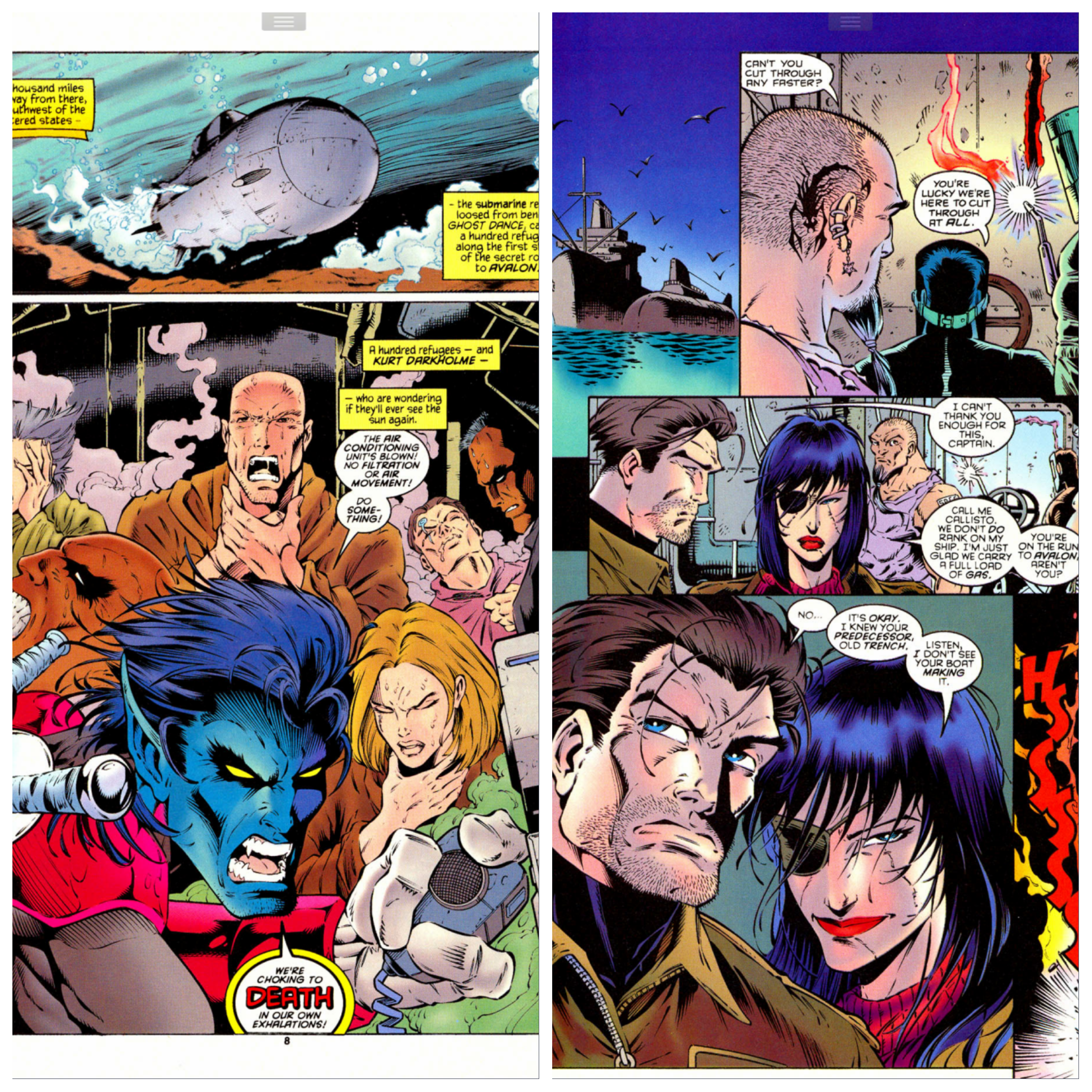 On the submarine that Proudstar filled with refugees from Apocalypse’s America, Nightcrawler is trapped with the others as an electrical fault has locked the doors and cut off the air circulation system. They call for help as they realise that the air in the room they are in will very soon run out. The sub’s captain (who seems to change appearance from page to page) doesn’t know what he can do, but the sub comes across the cargo ship X’d from Society who are offering assistance. The sub surfaces and the cargo ship’s crew then help cut the doors open to get the refugees to safety. The ship’s captain Callisto offers to take the refugees on her ship, which is at least safe for them to be on. As they are discussing this, Nightcrawler has teleported to the top of the sub, since he now knows where open air is. Since he wasn’t trapped in the hold, Callisto’s crew never see him.
