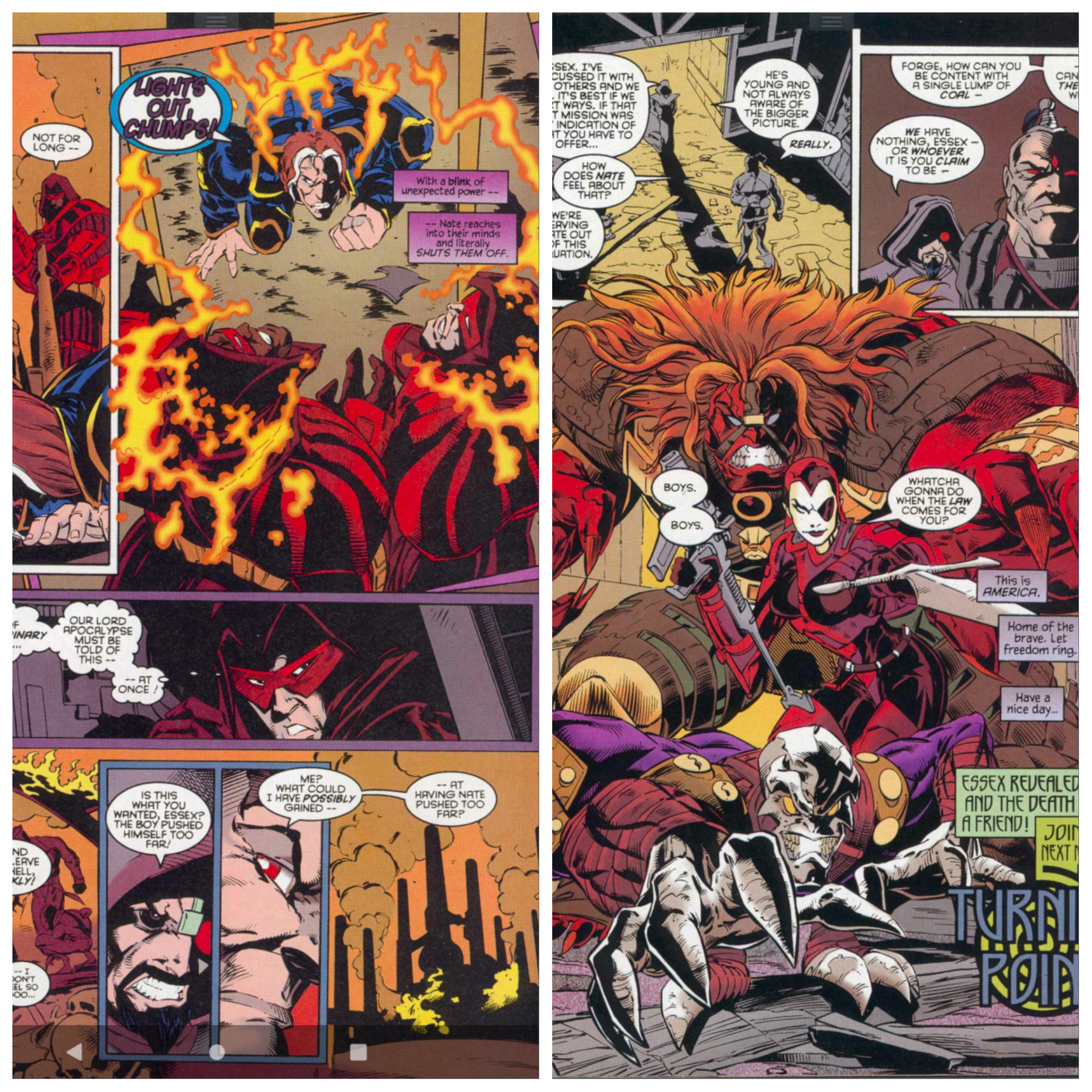 Back at the camp, now housed at an abandoned farm, Brute confronts Essex. He knows who he is, he remembers being experimented on and who by and despite him looking different, knows its the same man. Essex is disappointed to be found out, but quickly gets over this by killing Brute. Essex just finishes hiding the body when Forge arrives to officially kick Essex out of the group. Essex queries what Nate will think, but Forge has no time for that. Essex is about to monologue over Forge’s arguments when Domino, Grizzly and Caliban arrive to bring Nate in.