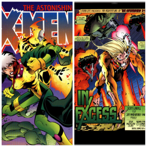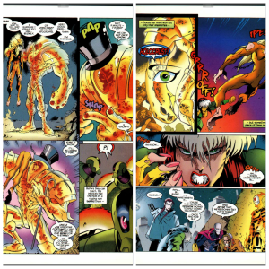 Wildchild is running from Infinites, the soulless and manufactured foot-soldiers of Apocalypse. He is shot and falls at the feet of his pursuers’ leader the Horseman I am calling Lava Lamp. It isn’t the Lava Lamp, it’s Morph whose impression soon devolves into comedic camp as he generates a top hat and talks about putting on a show. This is just a diversion as the Infinites are soon burnt to a crisp by an arriving Sunfire. Clearly irritated by Morph’s antics, Sunfire asks after Wildchild as does an arriving Rogue who appears with Blink through one of Blink’s portals. Wildchild licks Rogue’s face, allowing her to share his memories. Now she knows where Lava Lamp is and the X-Men are off to avenge Sabretooth.