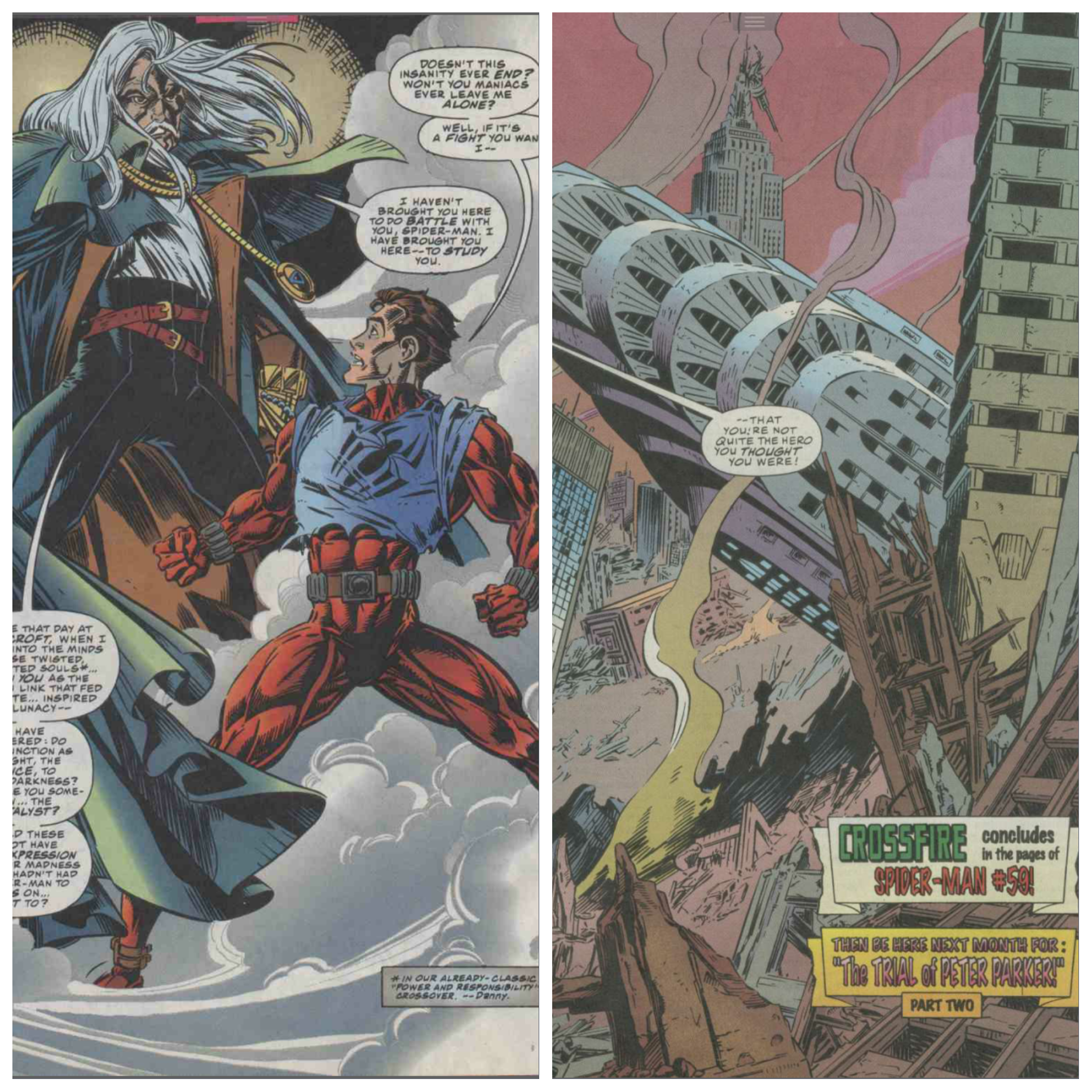 Of course they fight, at least until Traveller has had enough and paralyses Peter with a wave of his hand. He then tortures him with Traveller’s own pain, then runs him through with a sword and then finally goes for his soul, offering Aunt May’s soul and her return to life in exchange for one random person’s life. Peter rejects this offer, realising that almost all of this has been illusory and lays a heavy beating on Traveller. Traveller uses his powers to envelope them both in smoke and move them in space and time to show him a ruined New York and tells Peter that this ruination is all down to him.
