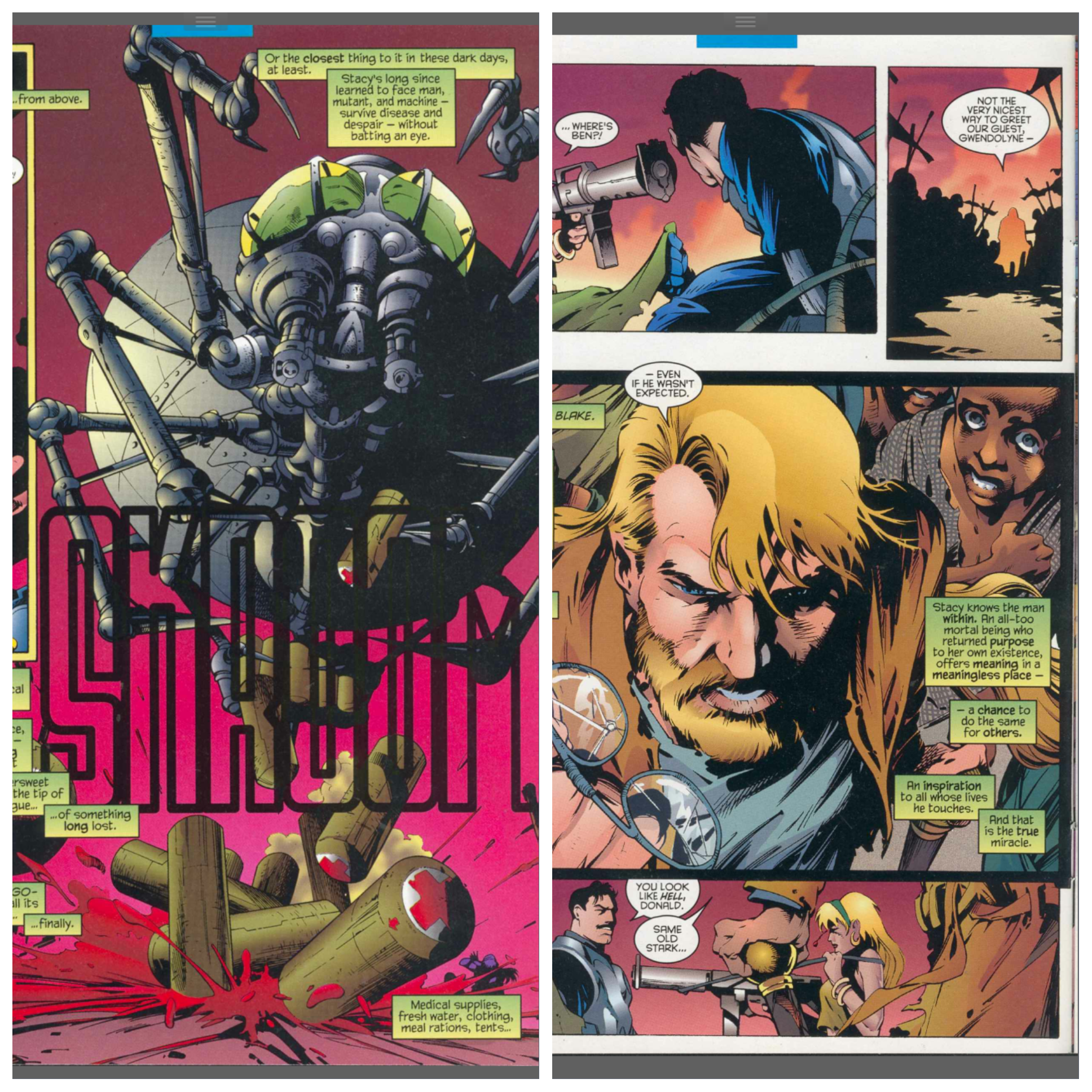 Plot: In the ruins of Africa, the human population of Earth is suffering. As well as a lack of food and medicine, they are prey for Marauders, humans who have sided with the mutant rulers of Apocalypse’s America to kill their own kind. Here four of these Marauders (Red, Dirigible, Owl and Arcade) are opposed by Gwen Stacy who holds them off long enough to be rescued by a giant robot spider with Tony Stark and Clint Barton aboard. They finish off the Marauders and drop off much needed medicine and food. The main reason they are there is to collect Gwen’s partner, Dr Donald Blake and get him back to England.