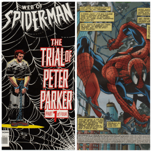 Plot: Opening Statements opens as the trial of Peter Parker starts and we get to see Spider-Man tracking down Kaine only for Kaine to tackle Spider-Man mid-air and start an brawl that goes on most of the issue. We split time between that fight and the court case where DA Blake Tower (always nice to see one of Marvel’s long-time bit characters) goes full crusading lawyer in his attempt to convict Peter (who thanks to Ben posing as Peter, isn’t actually in the courtroom) whilst Mr Locker does his best to point out that the jury have to make sure they have the right guy before convicting.