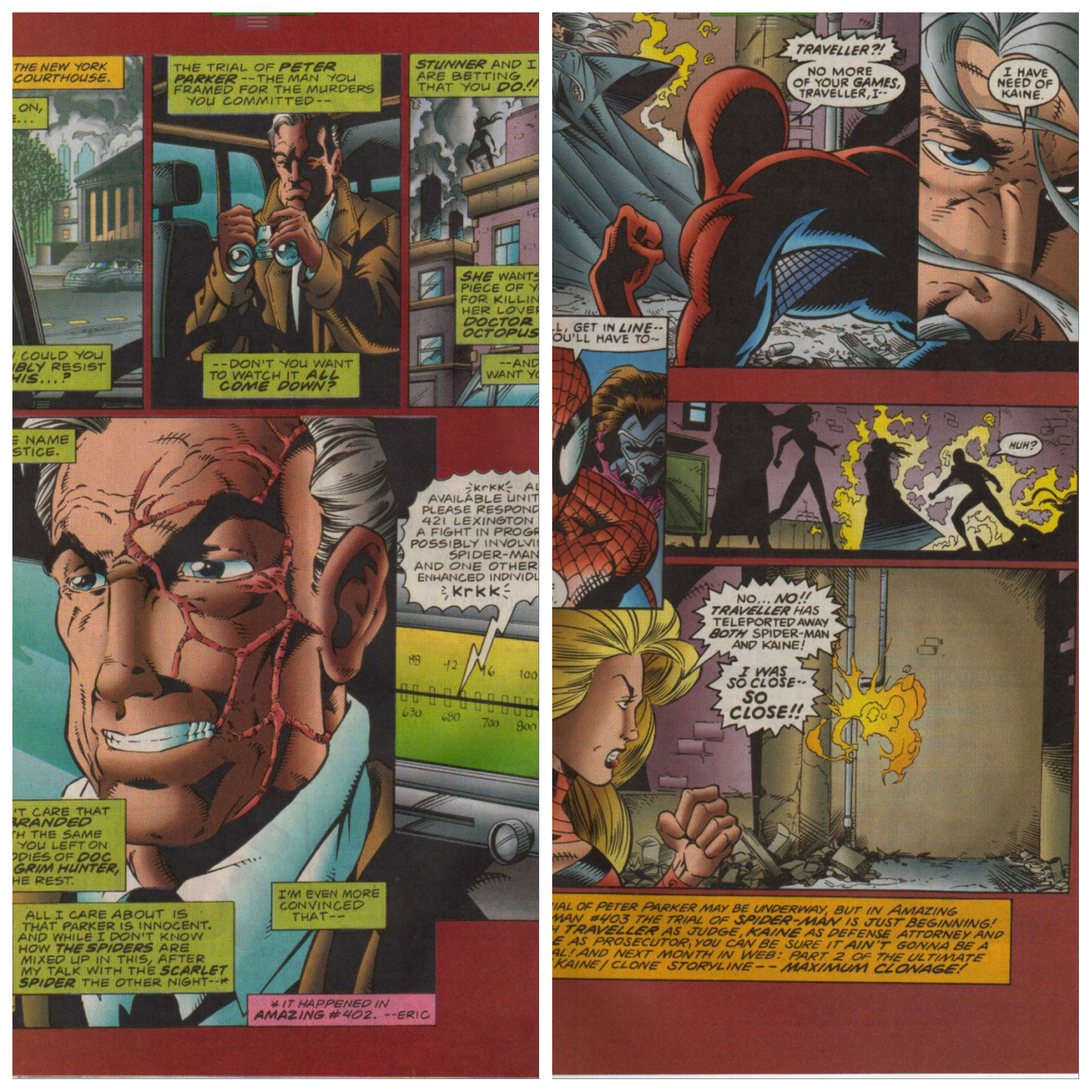 Notes: Wait, what? As we move towards a cliff hanger we get a game of two halves. Part one is the tense legal drama as Ben Reilly stands trials in Peter’s place for a series of murders which neither man committed. These scenes are well portrayed and hold your interest well. The second half is a bit different, an issue long fight with tension on 4 sides and then a deus ex machina ending where Kaine and Spider-Man are taken elsewhere by a sadly returning Judas Traveller. With the way this is done, it gives you the feeling that the writer didn’t know it was going to happen. As a result it comes across as abrupt and more than a little ridiculous. But this issue does move the clone/Jacob Raven/Kaine plot in the direction of a conclusion and offers us the idea that we’re finally going to get some answers.