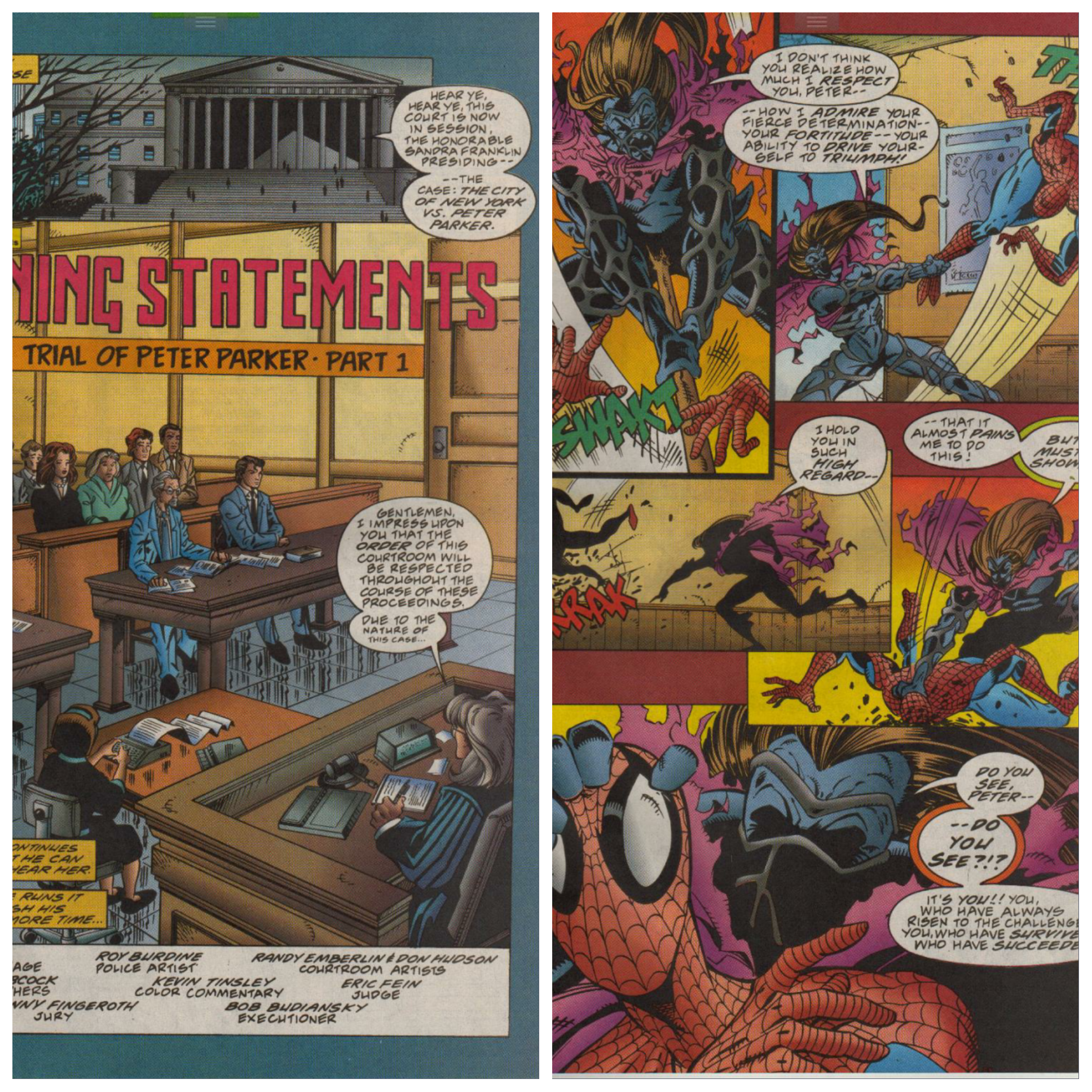 Plot: Opening Statements opens as the trial of Peter Parker starts and we get to see Spider-Man tracking down Kaine only for Kaine to tackle Spider-Man mid-air and start an brawl that goes on most of the issue. We split time between that fight and the court case where DA Blake Tower (always nice to see one of Marvel’s long-time bit characters) goes full crusading lawyer in his attempt to convict Peter (who thanks to Ben posing as Peter, isn’t actually in the courtroom) whilst Mr Locker does his best to point out that the jury have to make sure they have the right guy before convicting.