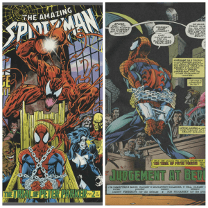 Plot: The Trial of Peter Parker part2 Judgment at Bedlam follows on from the out of left field cliff-hanger to the last issue Spider-Man finds himself restrained and in a makeshift courtroom. In the centre acting as judge is Judas Traveller, on one side is Carnage and the other is Kaine and what would either be the gallery or jury. Inside this area is Dr Ashley Kafka, John Jameson and Edward Whelan who are staff at the Ravenscroft Institute and several patients/inmates at Ravenscroft including Shriek, the Chameleon, Malcolm McBride and several others. Traveller states that Spider-Man is on trial here. Kaine is tasked with defending him on the charge on being a tool of evil. Traveller asks if Spider-Man has had a hand in creating these villains, thus creating more problems or is he one of the only things that prevents the evil that the inmates are capable of being unleashed on an unprepared society. Kaine violently objects, but Traveller puts him in his place, showing how ineffectual his ‘mark of Kaine’ is on him. Kaine relents, but he will not stop trying to defend Peter and save his life.