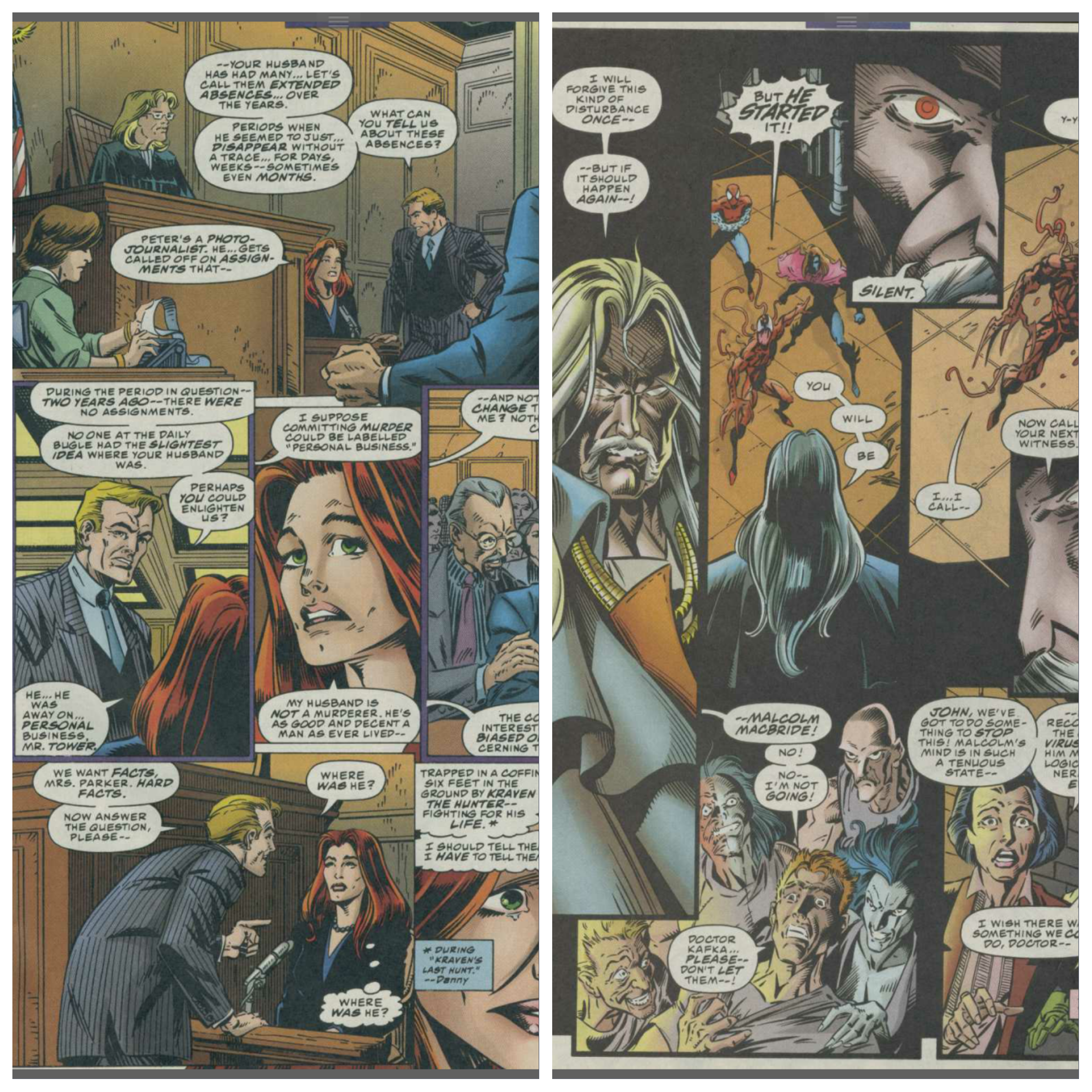 At Spider-Man’s trial, the prosecution (Carnage) calls it’s first witness (Carnage) who points out that the symbiote part of Carnage only exists because of the symbiote’s progenitor which Spider-Man brought to Earth. Kaine crosses the witness pointing out that Kassaday was a convicted serial killer and was a creature of evil before becoming Carnage. Things become heated between Carnage and Kaine and Traveller has to seperate them to bring order to the proceedings. Carnage then calls Malcolm McBride who became the villain Carrion through experimenting with the Jackal’s research. This was due to jealousy of another student, Peter Parker. Carnage then unmasks Spider-Man, showing Peter’s face to the ‘court’.