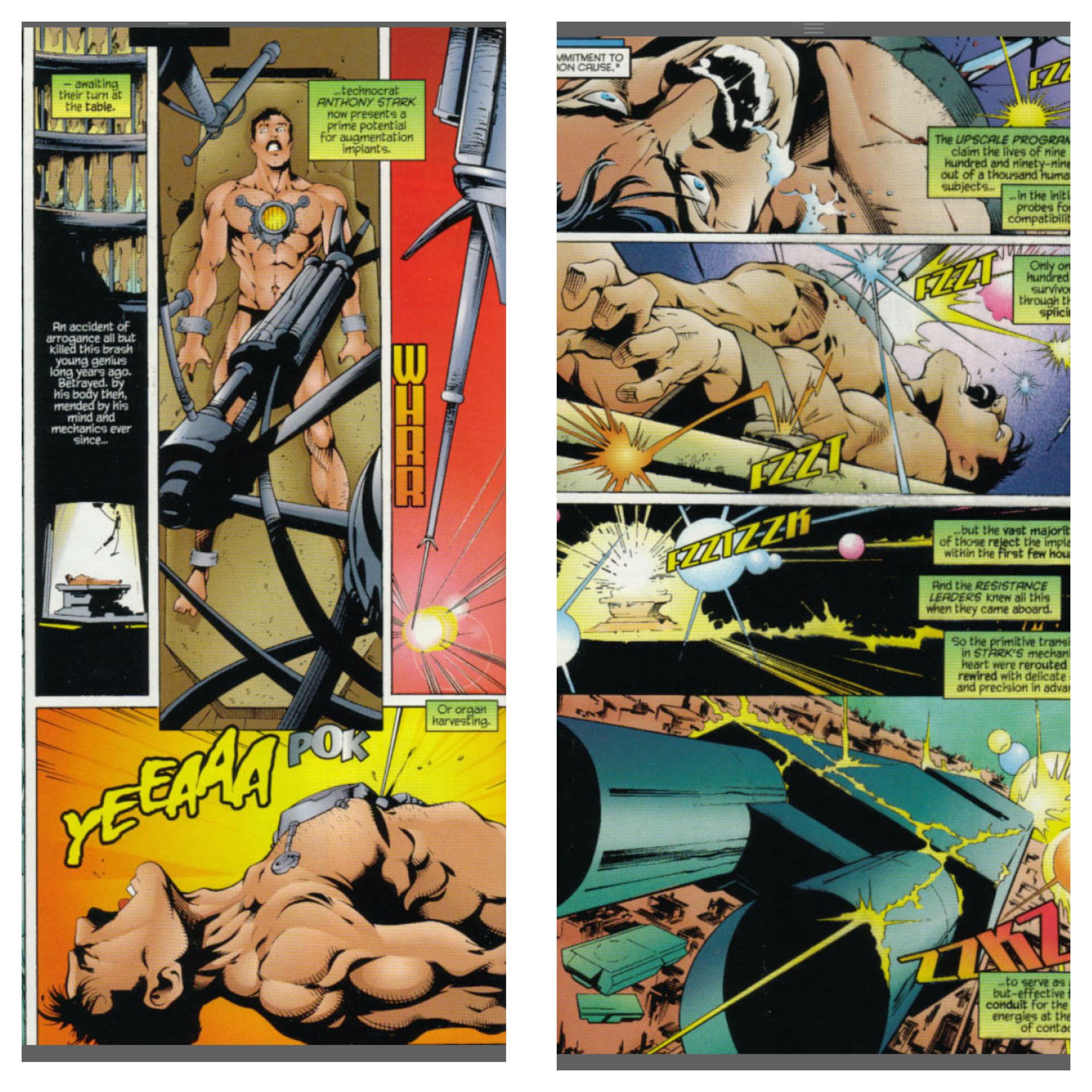 Plot: Following on from their capture by Mikhail in the last issue, the human rebels (Stark, Blake, Stacy, Storm, Grimm and VonDoom) escape using an electrical trojan horse hidden in Tony Stark’s chestplate. They then start the fightback against Mikhail and his forces. Emboldened by this turn of events, a larger force of humans attack and the fleet of transport arks that Mikhail brought are now in human hands. On Mikhail’s own ship Hulk arrives and halt Stark’s approach to the controls. Mikhail is distracted by taunting members of the human council and then faces Blake as this is going on Victor Von Doom takes Mikhail’s armed air ship and starts firing. On the main ship, Murdock accidentally touches Empath and finds his humanity reawakened. He kills Empath, freeing up more of humanity to rebel.