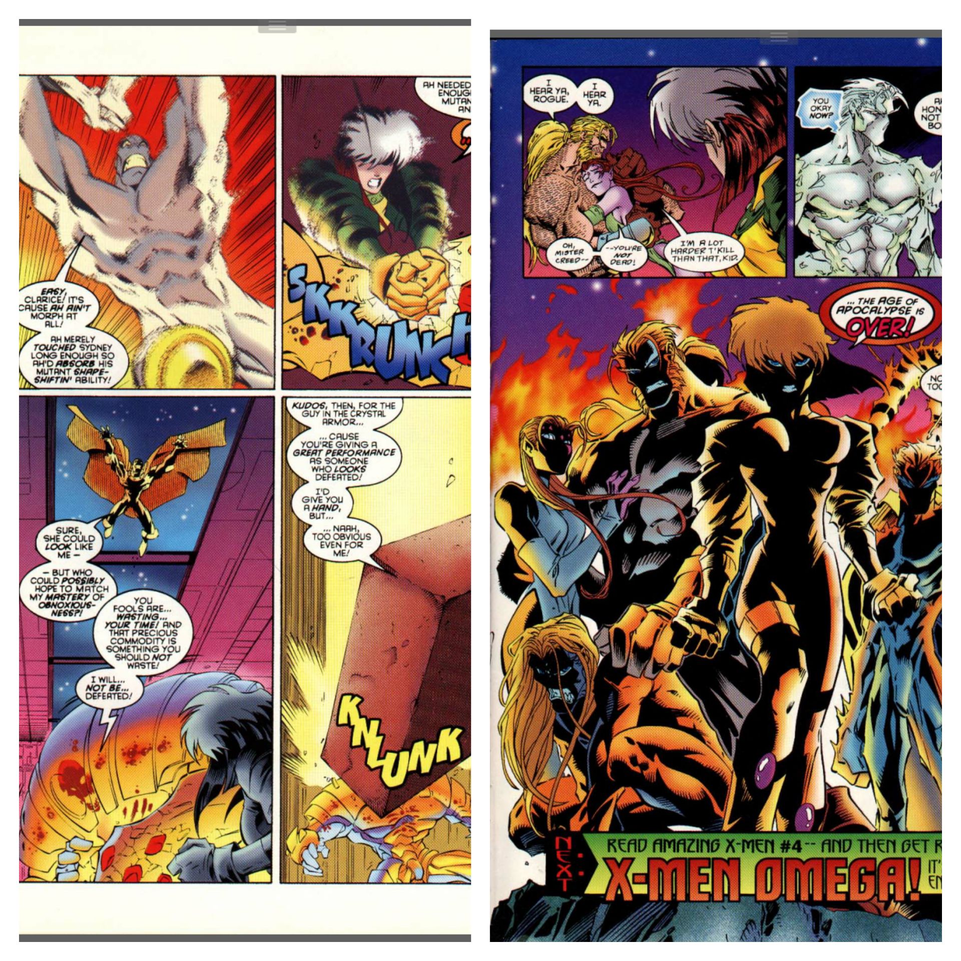 Whilst Sunfire and Wildchild free the humans who would be processed into parts for the Infinites, Rogue and Morph go after Blink. Lava Lamp gets out of the vat and fights back, but Morph arrives and attacks. Lava Lamp is taken aback by an electromagnetic attack, it turns out it’s Rogue using Morph’s powers, when the actual Morph arrives and drops onto Lava Lamp as a van sized brick, Lava Lamp is knocked back enough for Wildchild and Sunfire to appear and now the whole team is there. Lava Lamp punches Rogue into the ground and Morph changes into Rogue’s son to rouse her to action. Rogue flies back into the fight and when Lava Lamp threatens the actual son of Rogue, she hits so hard his containment suits starts cracking and he has to teleport away. Iceman arrives to stop Rogue following, bringing with him the almost but not actually dead Victor Creed. They don’t have a plan, but Rogue declares that tonight the Age of Apocalypse ends.