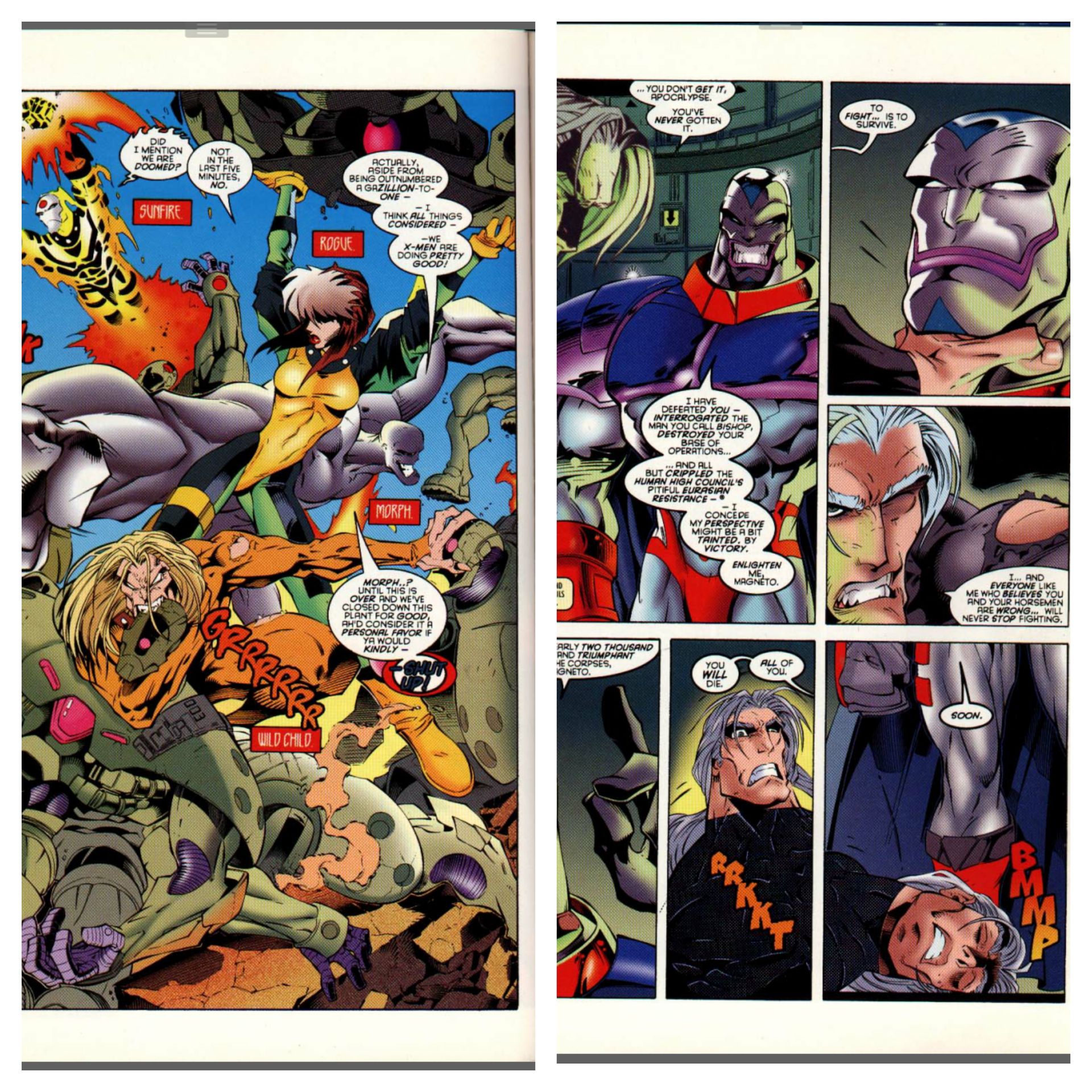 Plot: During the cullings, Blink tries to avenge Victor Creed’s murder at the hands of Holo-Nope, still calling him Lava Lamp. Blink leaves Lava Lamp in the chemical vats used to break down human bodies. Outside, the Infinites face Sunfire, Rogue, Wildchild and Morph who battle on, despite believing that they’re doomed against this army of stormtrooper-esque soldiers. Elsewhere, this is being observed by Apocalypse, who shows the scene to a captured Magneto to help break his spirit, but Magneto knows about surviving the worst of humanity and it doesn’t work.