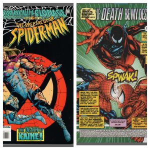 Notes: Very much a game of two halves here and so I’ll start with the good. Splitting the action between the Jackal’s lab and elsewhere in the city, we get a sense of the plot moving forward at breakneck speed. The New Warriors get involved, MJ worries about the state of her marriage as she sees the clone of her old friend and the first great love of her husband’s life. In the lab we get the deaths of several clones, causing mental and physical upset to Ben as he vomits over the clone mob’s fate. Then we have Kaine’s death and the betrayal of Spidercide and that’s a hell of a lot in a short amount of time. That was the good.
