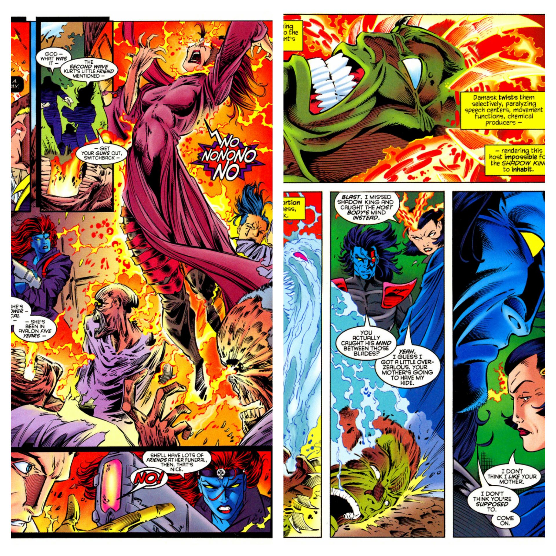 To prevent more loss of life, Mystique kills the mutant that the Shadow King was using and it just moves on. He then posses Marcus, a mutant with not unexpectedly ill defined abilities. To save Destiny, Damask uses her power of psychic skinning (I know, but let’s keep going anyway) and effectively lobotomises Marcus. Doug is horrified, but Nightcrawler points out by living in Avalon, safe from the horrors he has run away. As this conversation goes on, the Shadow King jumps into Mystique, this time Nightcrawler sees how he does it and convinces Switchback and Damask to teleport with him, so Switchback can slow time and Damask can Skin the Shadow King between seconds saving Mystique.