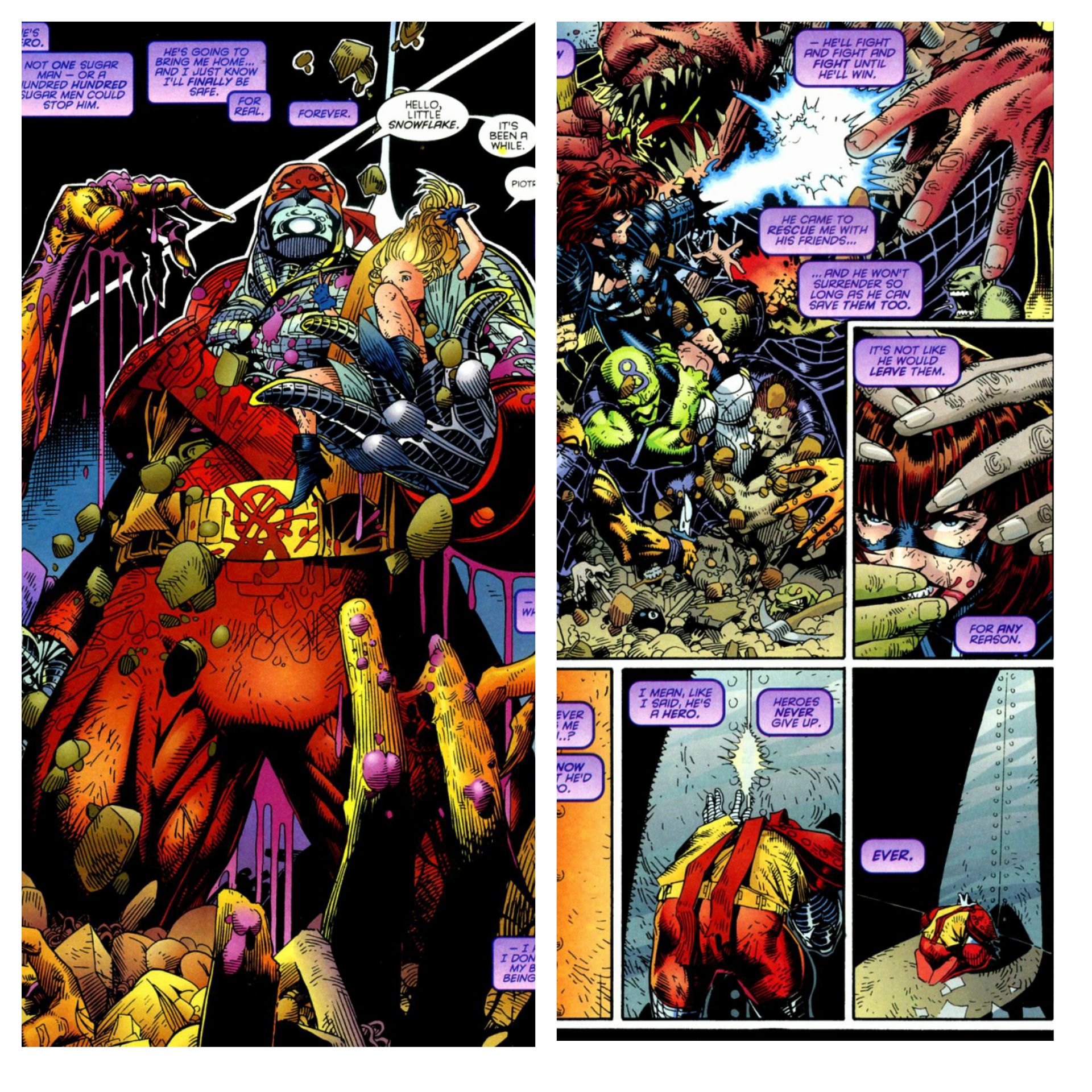 Verdicts: Art 5 out of 5- Chris Bachalo in his weird period is a joy to behold, even when it’s a dark and miserable world you’re beholding. Every page holds some extra tid-bit, extra pic or quirk that makes it a dream to just look through. Quietus and the Sugar Man are characters that would not work in the hands of another art team, but here it all fits into the world. Beyond the weirdness, this has moments of pure illustrative artistry. The look on Husk’s face as Colossus leaves is haunting in a way that seems impossible to be just paper and ink. The last shot of her is also striking and reminds you that the ones who fell bravely were just children and that doesn’t go away just because the issue has ended.