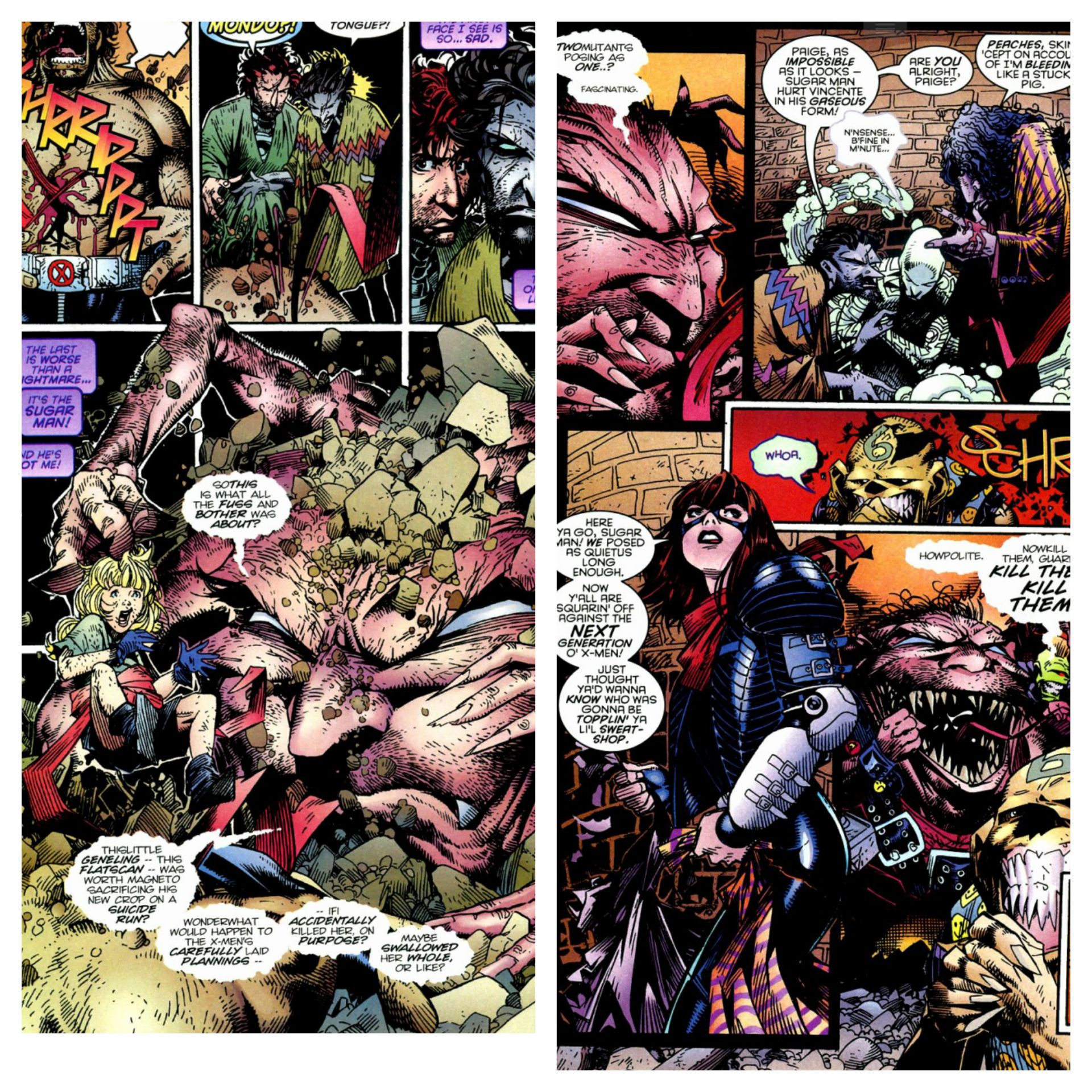 Plot: Mondo has found and retrieved the lost Ilyana and is making his way to the exit, diverting the guards Husk and Vincente (posing together as 2nd in command Quietus) is facing the Sugar Man who has told them to kill Skin, who is between them. When Quietus hesitates, a suspicious Sugar Man fires his tongue at the mutant, revealing Husk and Vincente. Then a previously considered dead Chamber appears and starts shooting with a guard’s fun. Then to cover their escape obliterates the Sugar Man with the powers that emminate from his chest. But with only Sugar Man down, there is no escape for this beleagured quartet until their teachers arrive.