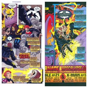He arrives above the citadel, but feels a pull elsewhere and following it finds himself in the midst of the culling of the pens started in Factor-X 3. In the chaos he finds Cyclops and Jean Grey, his parents and there’s a feedback between him and Jean, they both recover and Jean invites Nate to join them. Cyclops remembers the kid, but they have their own path and Nate has a destined meeting with Apocalypse.