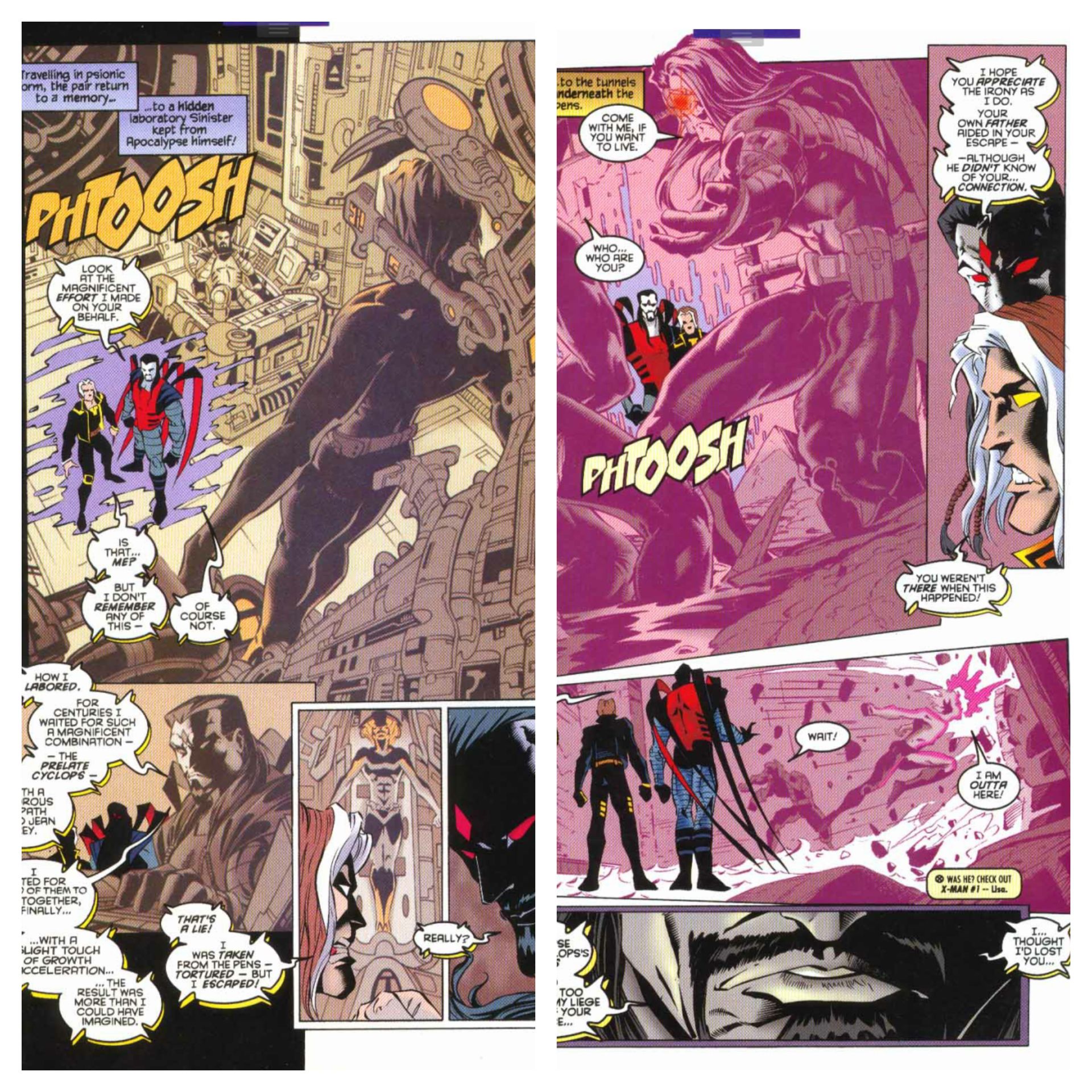Plot: The Shadow King informs Apocalypse that Domino has fallen and that her quarry (lead character Nate) is a bigger problem than was originally thought. Apocalypse starts off enraged, but the muses about survival of the fittest and goes off to continue interrogating/torturing Magneto. Far from Apocalypse’s citadel, Nate confronts Sinister, who he now knows has killed friend Brute and his father figure Forge. Nate’s PK blast punches through Sinister, but it heals instantly. Sinister asks Nate to look into his mind and learn of his origins.