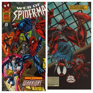 Plot: Ben (as Scarlet Spider) arrives at the Crashpad to find the rest of the New Warriors out, he speaks to Hindsight (the team’s resident ‘man in the chair’) and finds out about the call from Mary Jane. Nearby a battle is raging between the New Warriors and Spider-Man, for the life of Mary Jane, whom Peter has been mind controlled into trying to murder. The Warriors are doing okay, but Peter (as Spider-Man) has more skill and experience and the whole team can do no better than keeping him at bay. He still breaks free and chases after MJ onto the street, where he is tackled by Ben. Everyone is still struggling, by MJ commandeers a cab and drives off, after realising she has a plan.