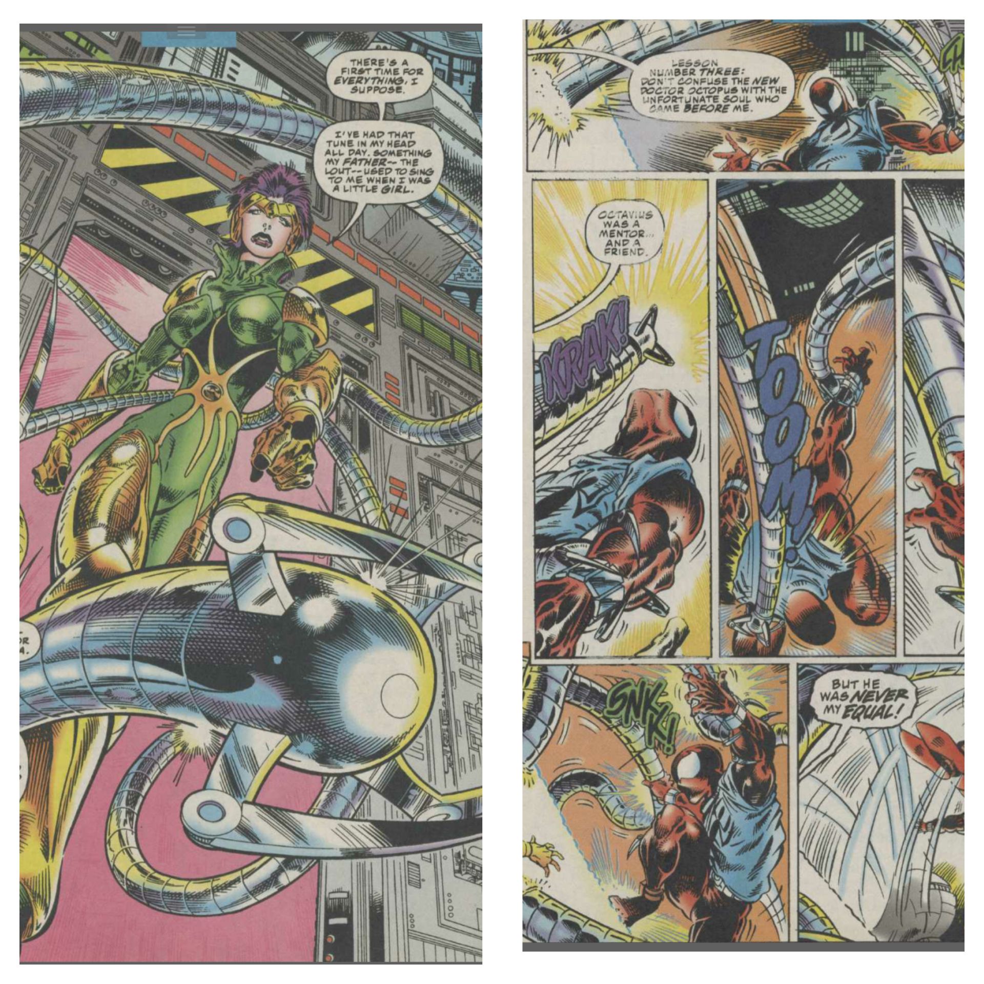 In the heart of the city, agents working for Doctor Octopus II set off something called a Virtual Reality Bomb and the heart of New York becomes a cut scene from a Jurassic Park film. This was a successful test and a real bomb is now to be constructed. Later that night, Doctor Octopus II visits Seward’s lab and threatens him to get his cyberspace research. Ben (in his Scarlet Spider outfit) is skulking in the shadows and leaps at her, but she quickly dispatches Ben as she has a personal forcefield that protects her, she was a student of the original Doctor Octopus, but considers herself his superior. As Ben tries to get up, his opponent grabs Seward by the throat, revealing herself to be his daughter.